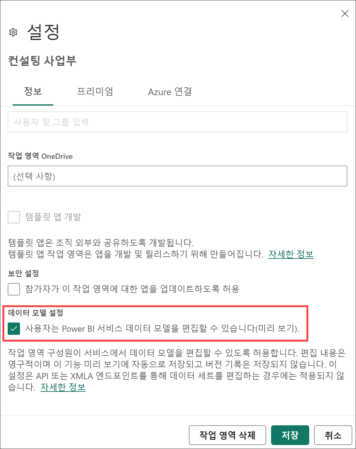 내 작업 영역에서는 기본적으로 기능이 활성화되어 있습니다. 작업 영역에서는 기능을 활성화해야 하며, 사용자가 데이터 모델을 편집하려면 데이터 세트 쓰기 및 빌드 권한이 있어야 합니다.