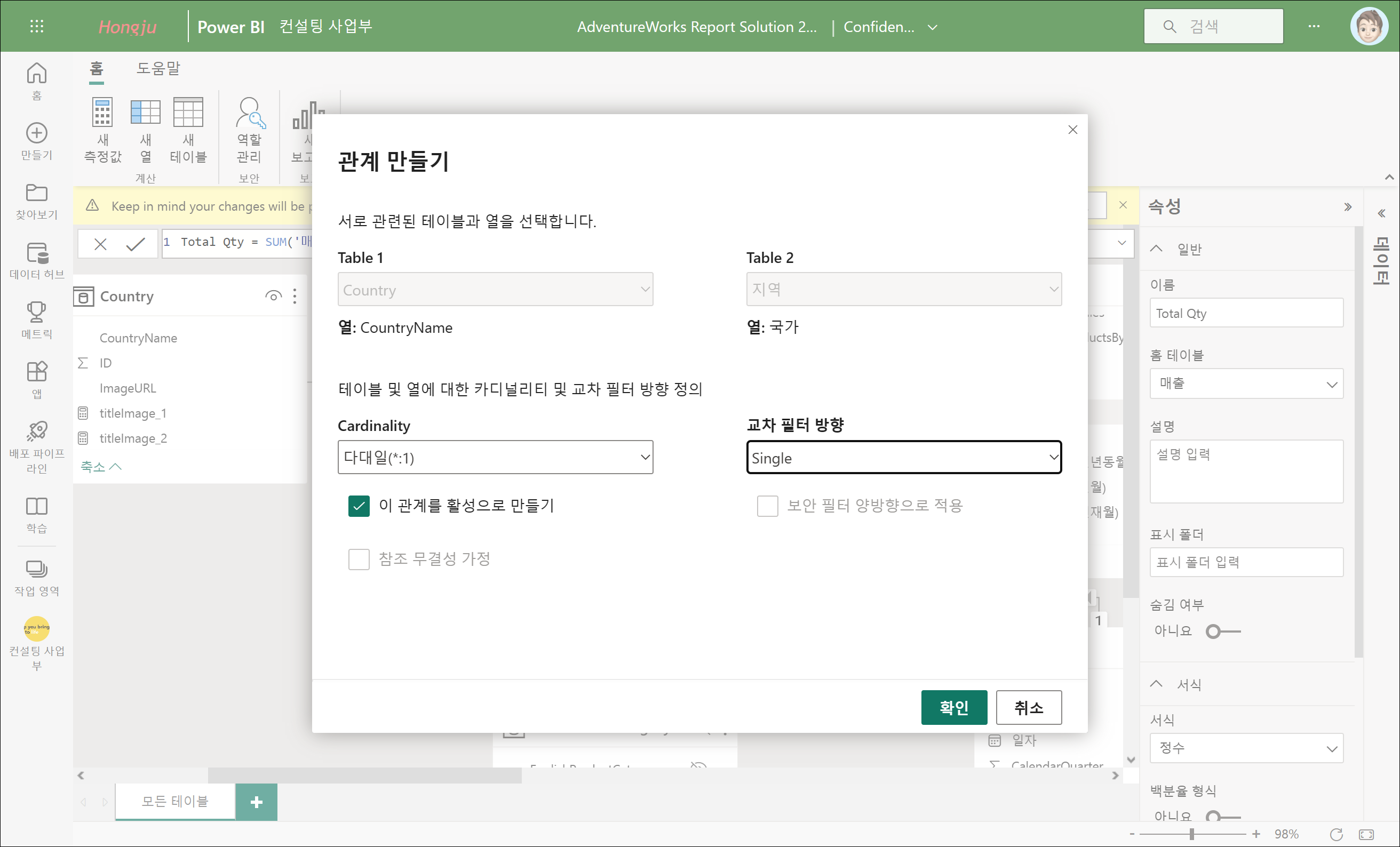 관계를 생성하려면 테이블의 필드를 선택하고 다른 테이블의 필드로 드래그 하면 됩니다. 관계를 편집하려면 관계를 더블 클릭하면 됩니다.
