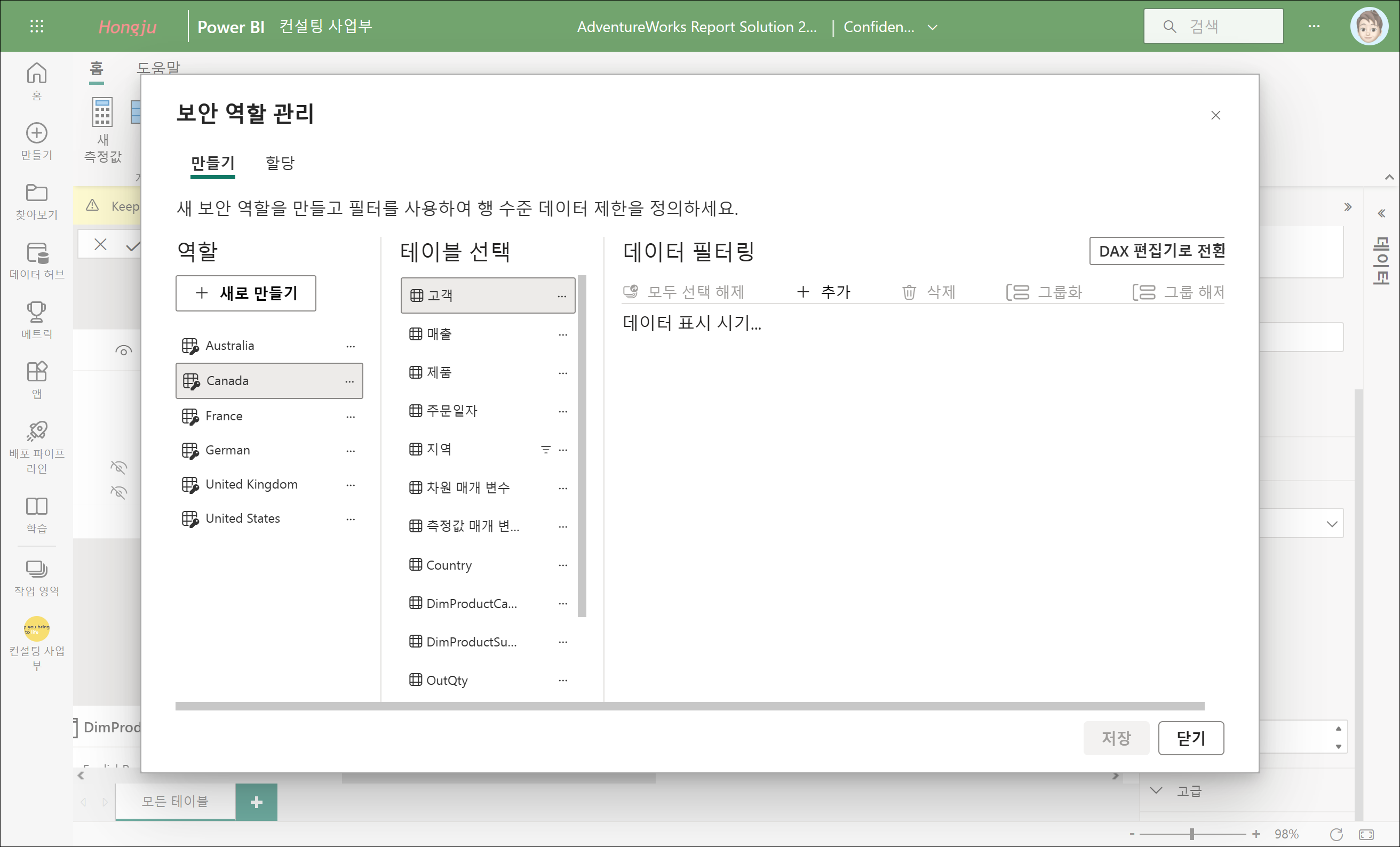 Power BI 서비스에서 행 수준 보안의 역할을 생성/수정하고, 규칙을 수정할 수 있으며 역할에 사용자를 할당할 수 있습니다.