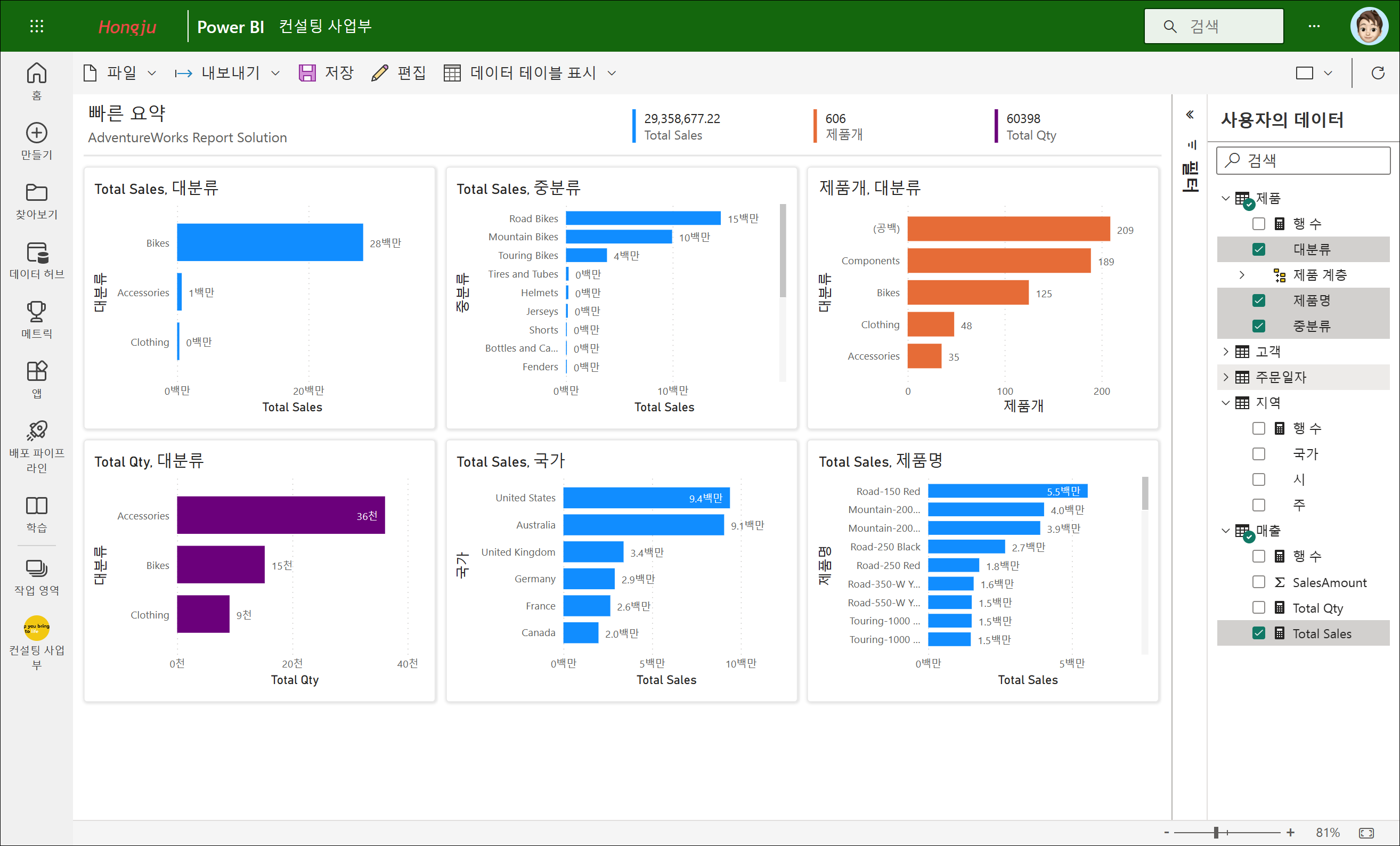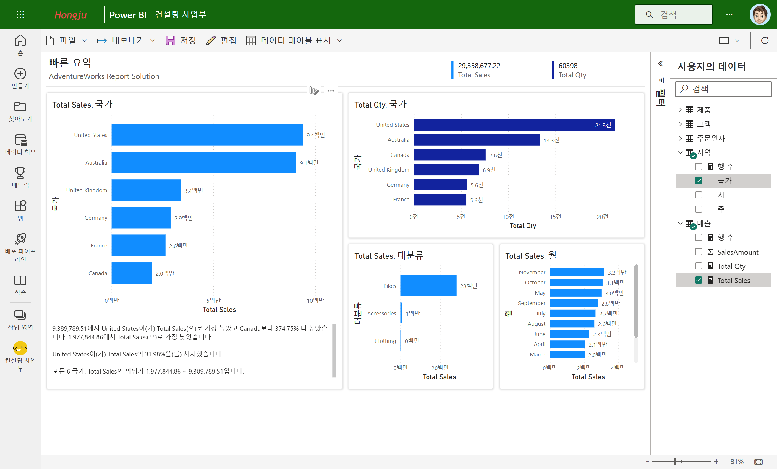 제가 선택한 데이터 세트에서는 국가 필드와 Total Sales 필드가 선택되어 관련 시각화가 나타납니다. 상단에는 요약 정보가 나타나며, 여러 막대형 차트가 표시됩니다.