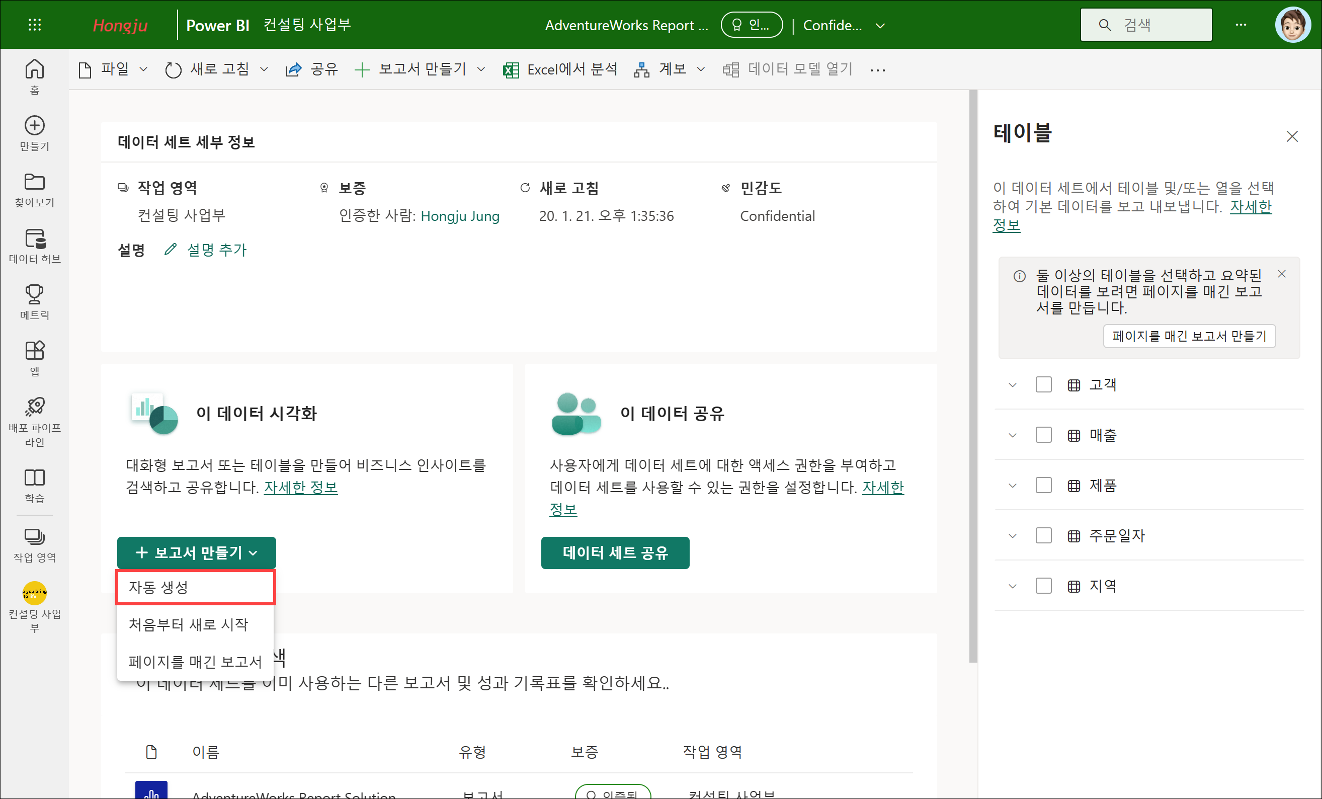 Power BI 서비스의 홈에 보면 [새 보고서] 메뉴가 있습니다. [새 보고서]를 클릭하여 데이터 세트를 선택하여 보고서를 자동 생성할 수 있습니다. 또는 데이터 세트 페이지로 이동하면 [보고서 만들기]를 클릭하여 [자동 생성]을 클릭하면 됩니다.