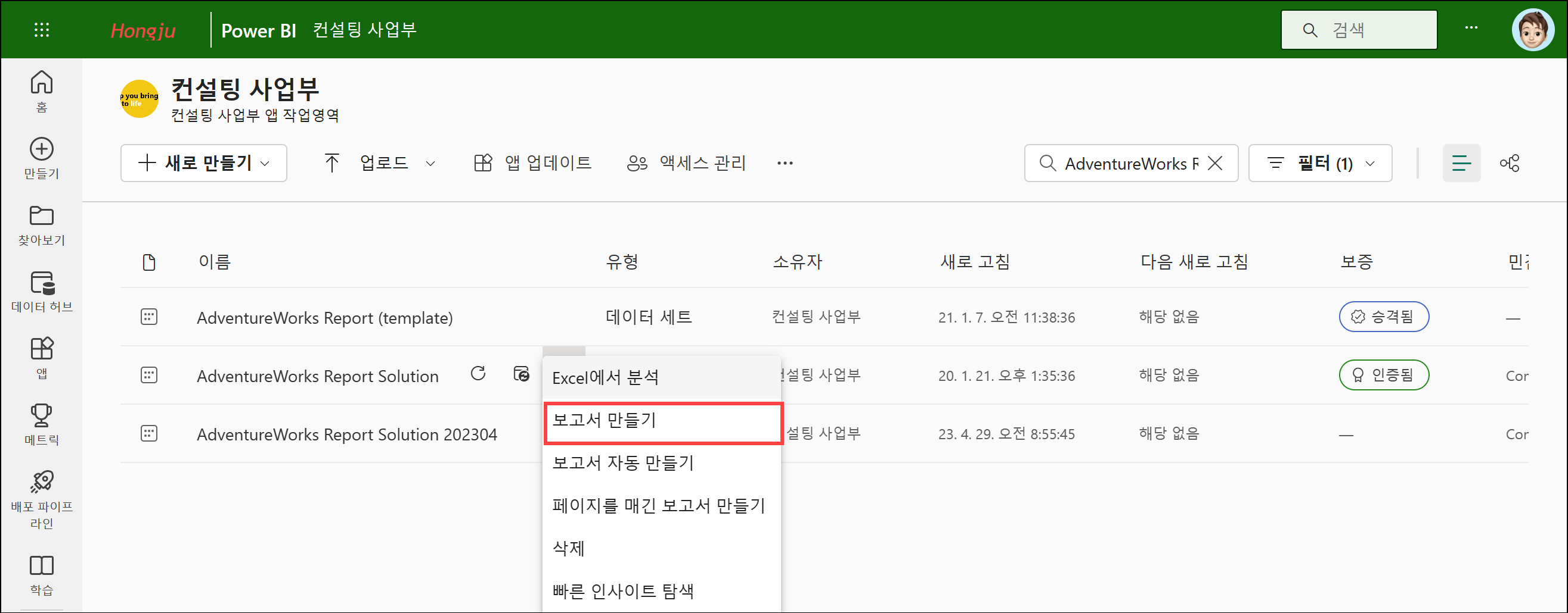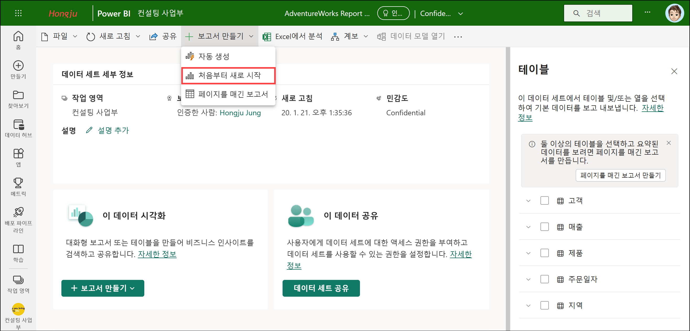 Power BI 서비스에서 보고서를 생성하려면 해당 보고서 세트에서 ‘보고서 만들기’ 또는 ‘처음부터 새로 시작’을 선택하면 됩니다.