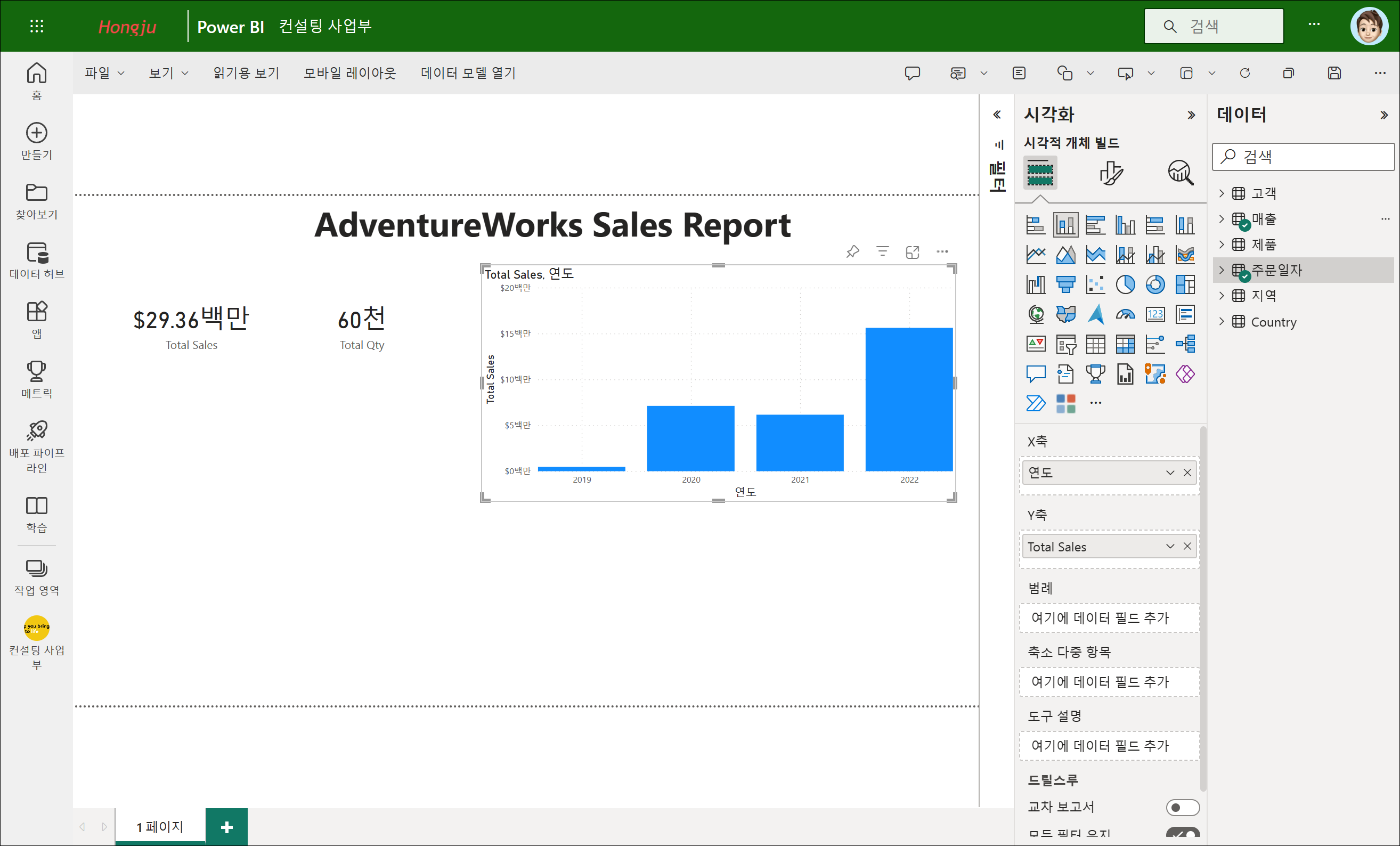 Power BI 서비스에서 새 보고서를 만들 수 있습니다. 데이터 건수, 데이터 가져오기 모드에 따라 제한이 있을 수 있지만, 필요시 Power BI Desktop을 이용하지 않고도 보고서 생성이 가능합니다.