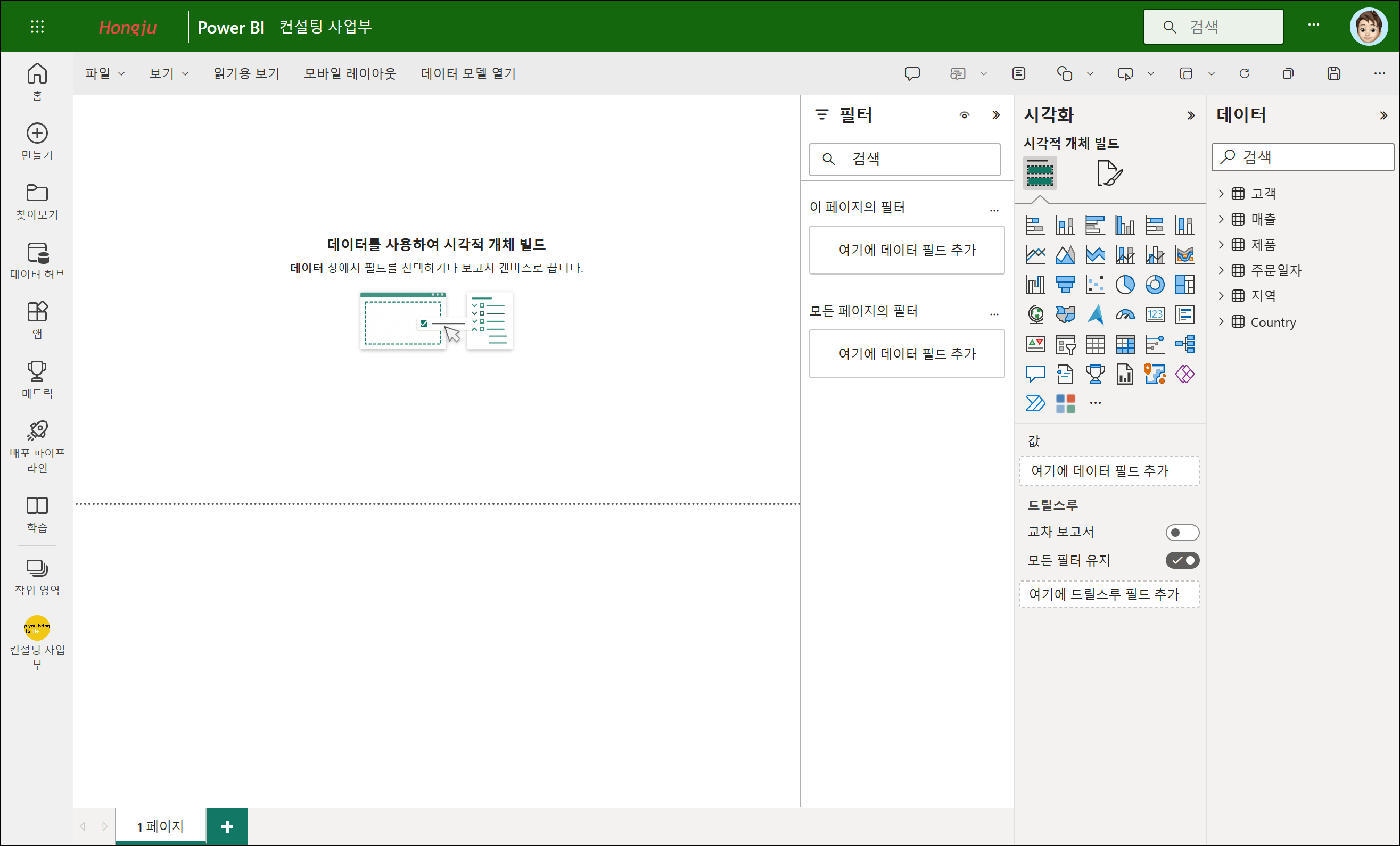 새 보고서 환경은 데이터, 시각화, 서식, 필터를 이용하여 보고서를 만들 수 있습니다. Power BI Desktop의 보고서 만들기 환경과 방법에서 차이가 없습니다.