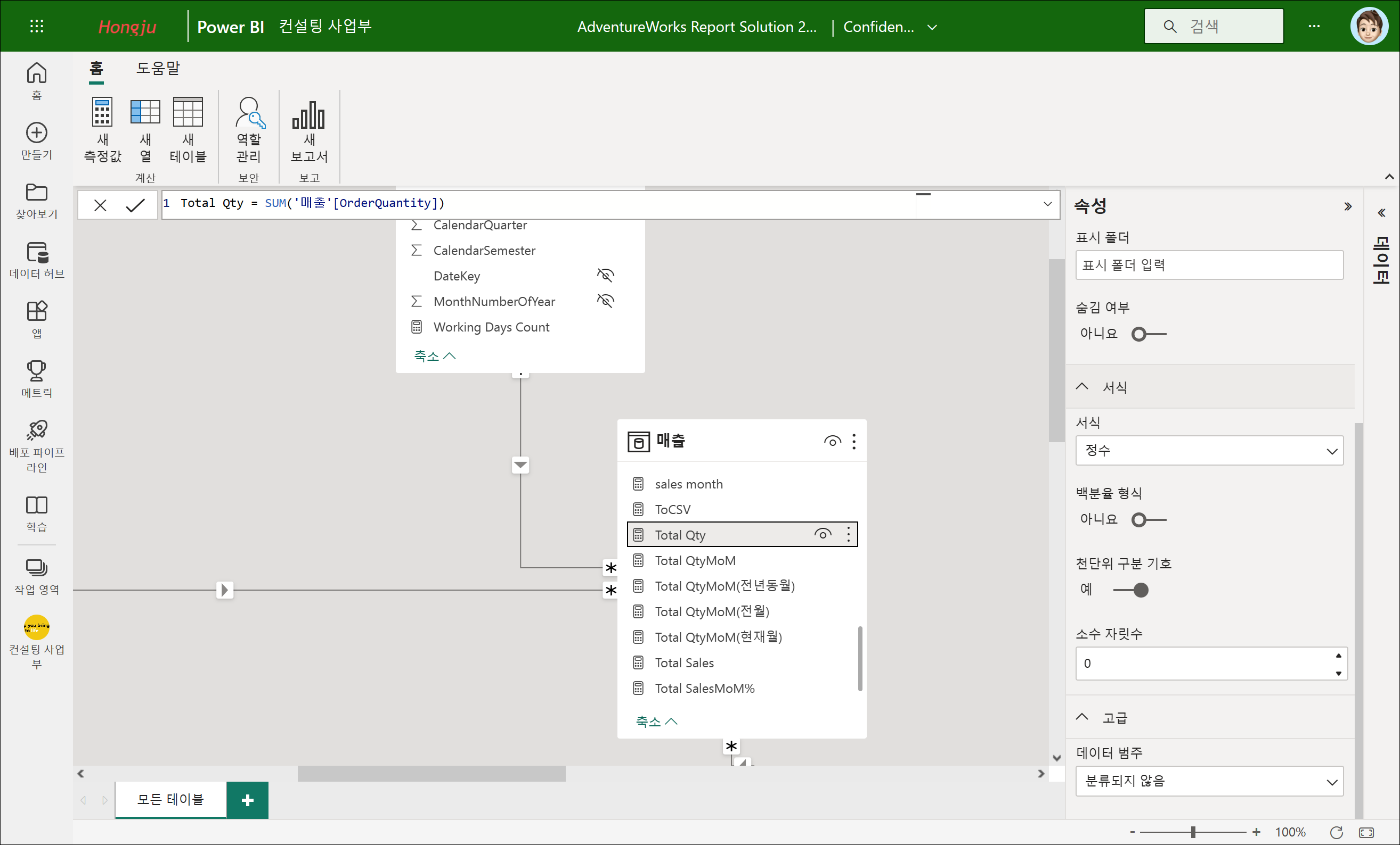 Power BI Desktop을 열지 않고 데이터 모델(미리 보기)를 통해 관계 편집, 행 보안 수준, 데이터 형식, 측정값 등을 변경할 수도 있습니다.