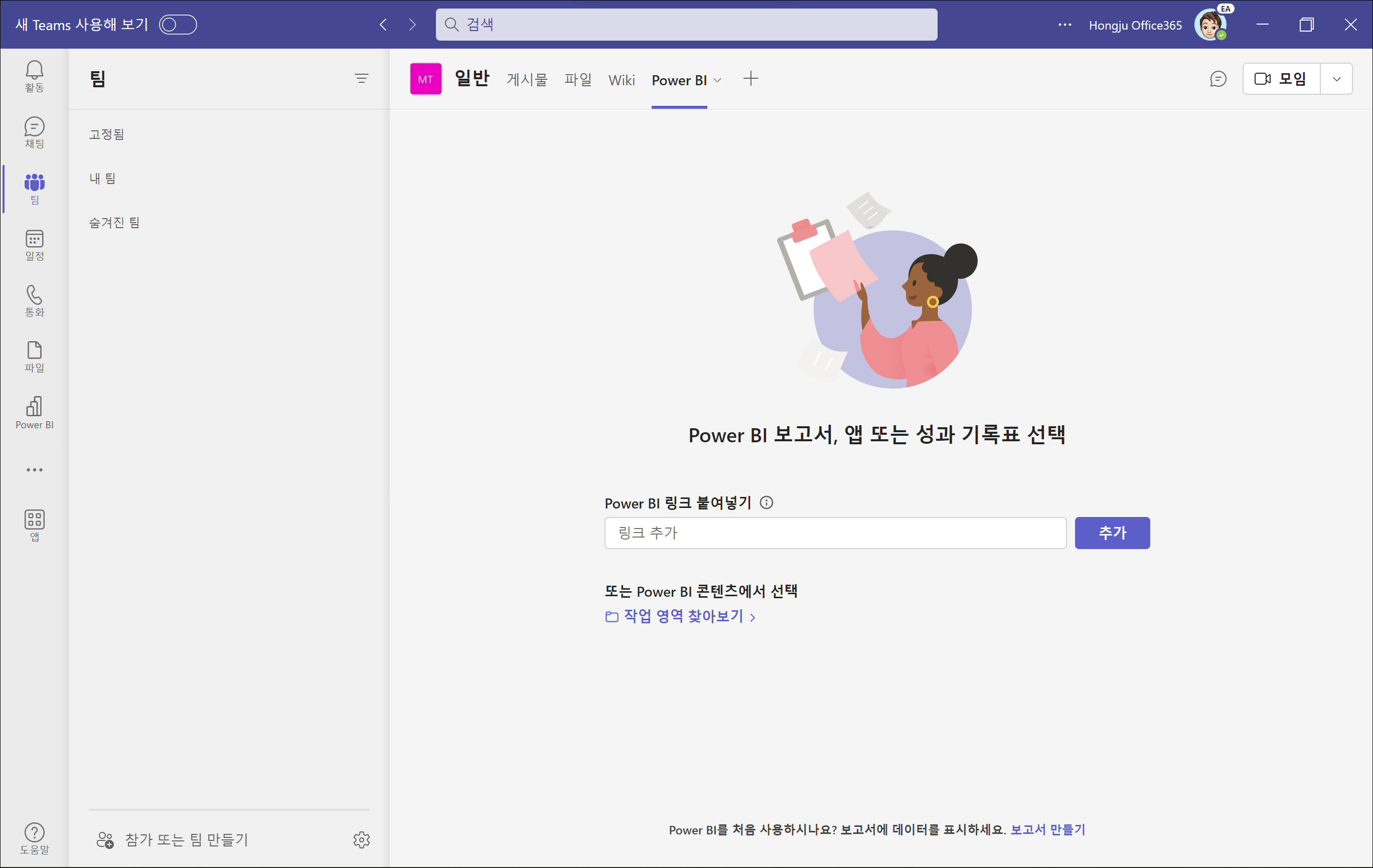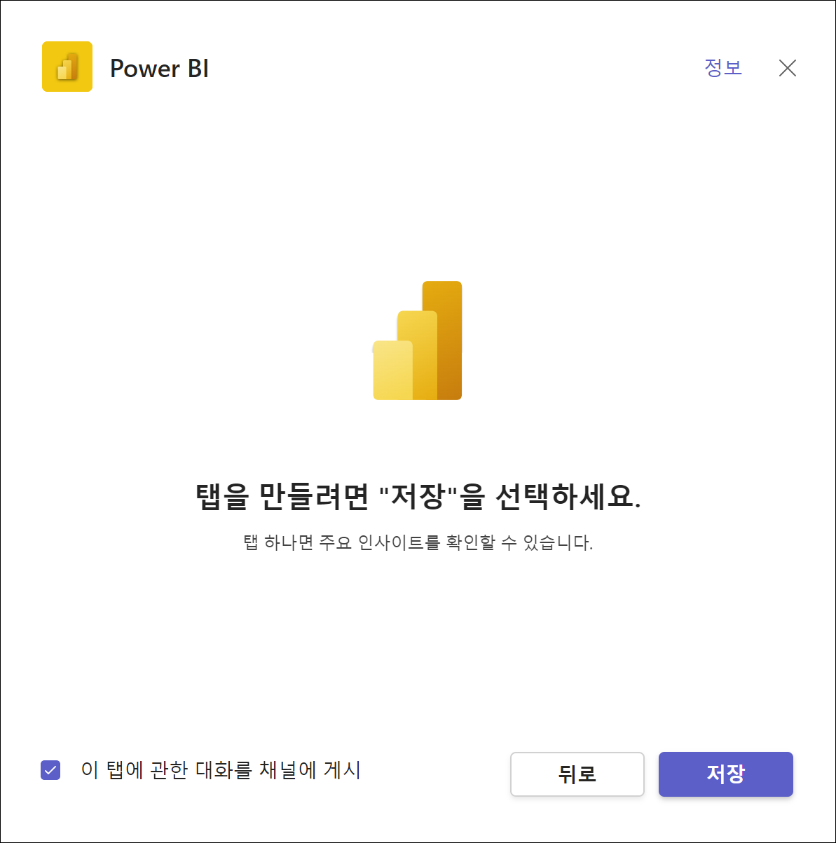 Microsoft Teams에서 Power BI 탭을 추가할 수 있었는데, 탭 추가하여 보고서를 연결하는 방법이 일부 변경되었습니다. 탭을 추가하면서 저장하면 됩니다.