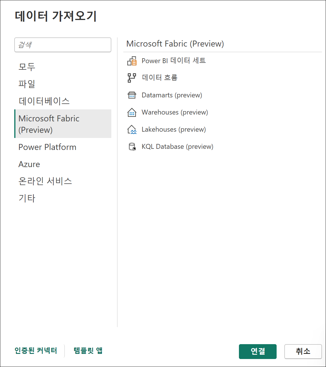 Power BI Desktop의 데이터 가져오기에서도 Microsoft Fabric 카테고리가 제공됩니다.