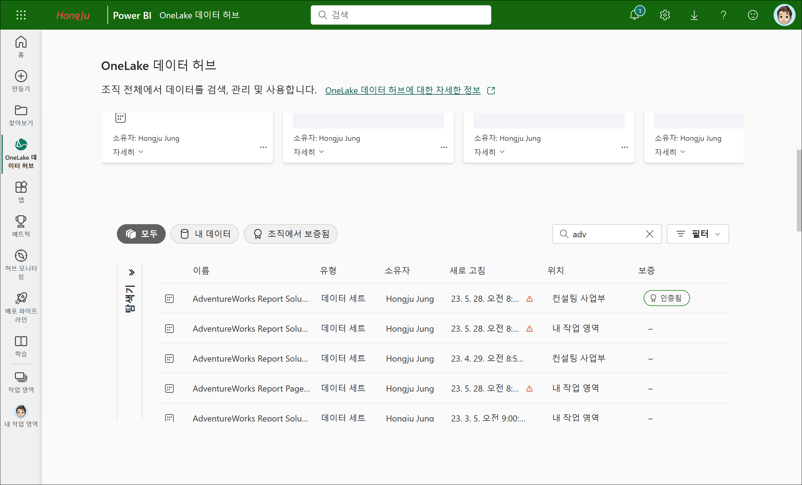 Power BI 서비스에 로그온해보면 왼쪽 메뉴가 변경되어 있는 것을 확인할 수 있습니다. 기존의 ‘데이터 허브’ 메뉴가 ‘OneLake 데이터 허브’로 제공되고 있습니다.