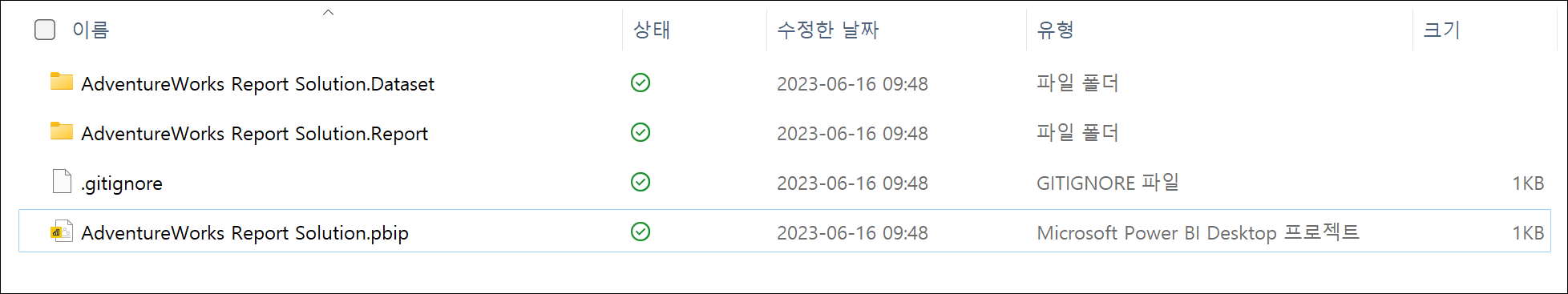 저장된 폴더의 내용입니다. DataSet, Report 폴더와 pbip 파일, gitignore 파일을 확인할 수 있습니다.
