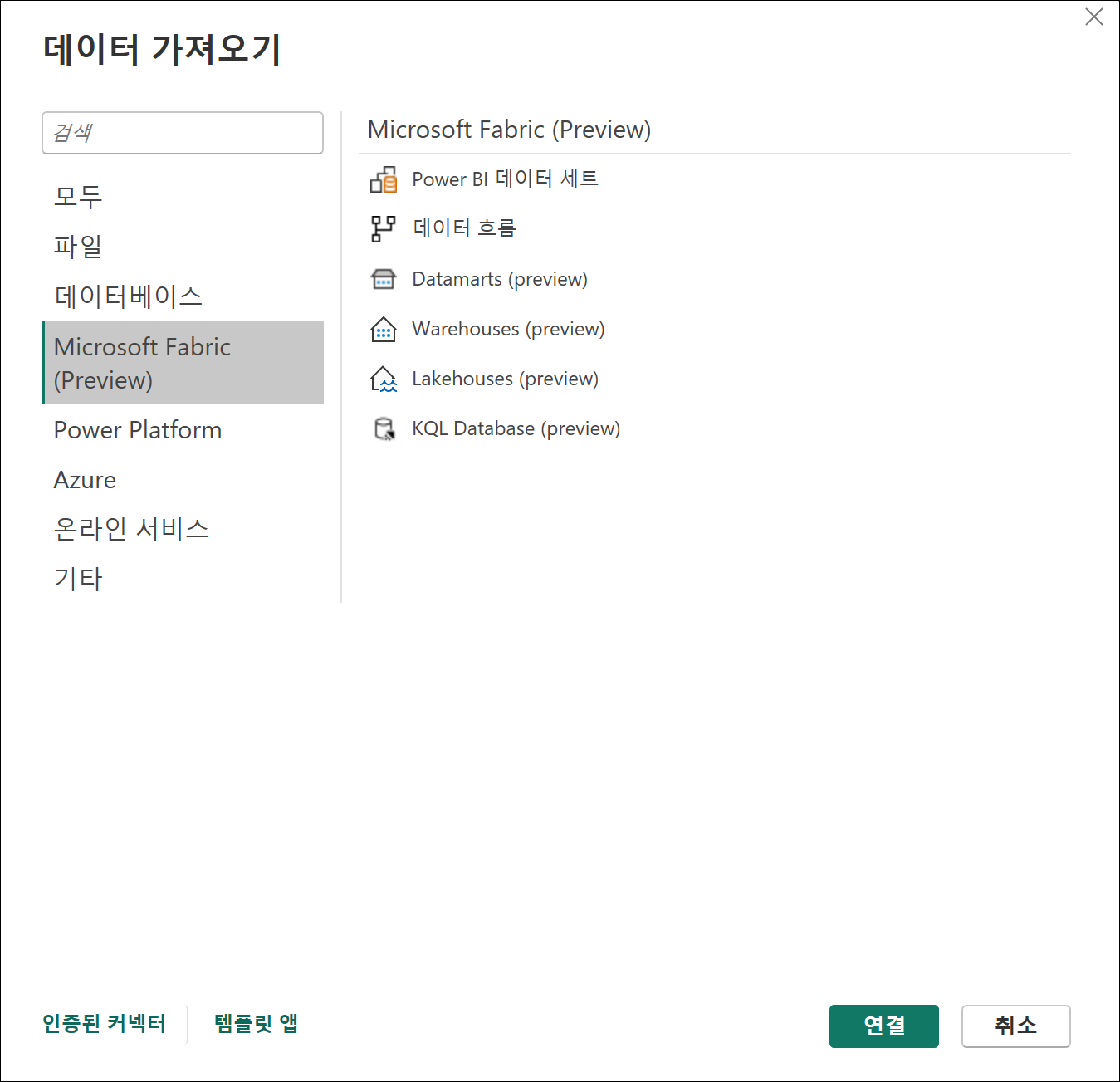 데이터 가져오기에서도 Microsoft Fabric 항목을 확인할 수 있습니다.