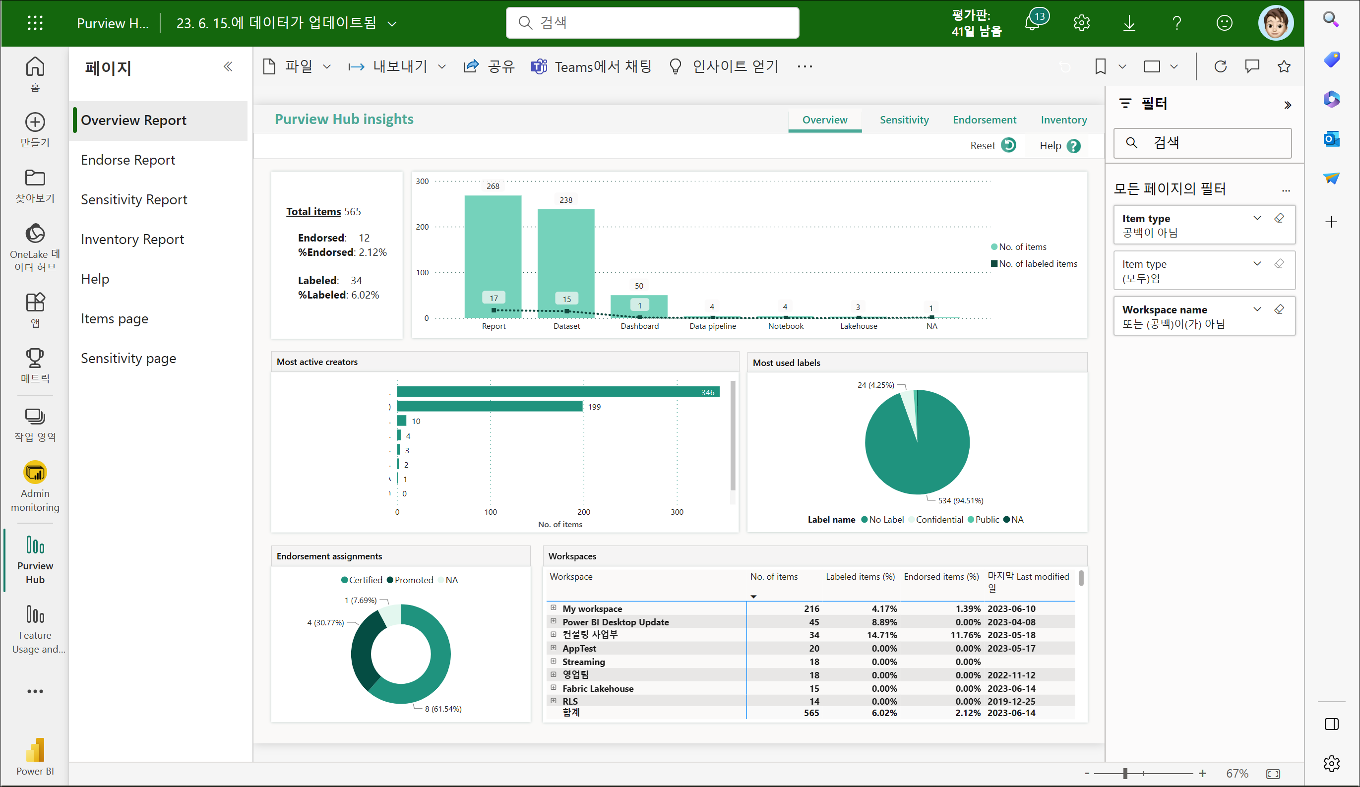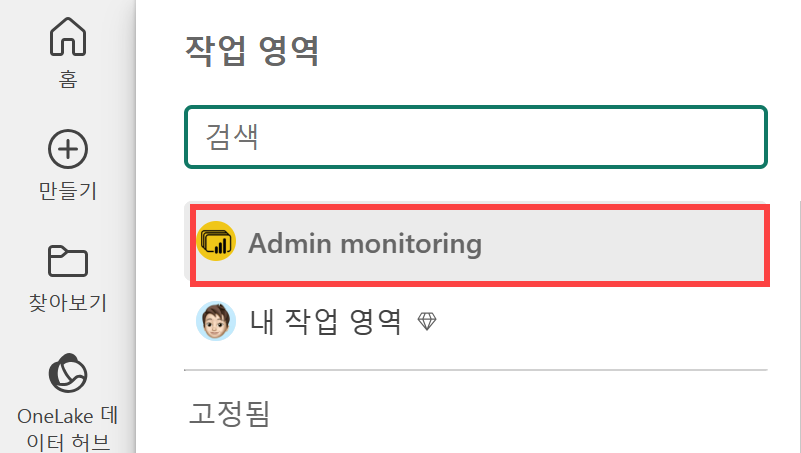 Power BI 서비스 관리자로 로그온하여 작업 영역을 확인해보면 [Admin Monitoring] 작업 영역이 붙어 있는 것을 확인할 수 있습니다.