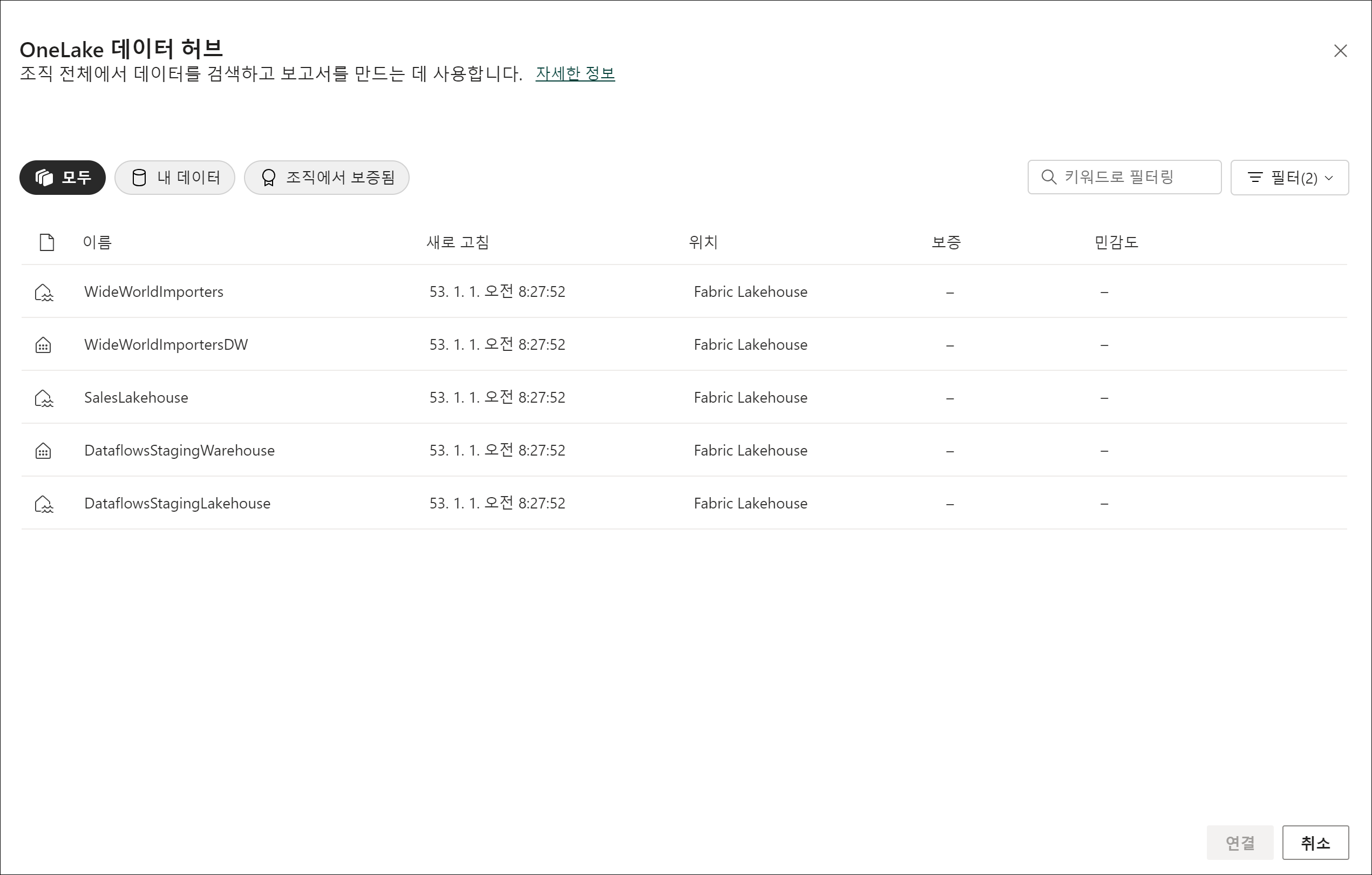 OneLake 데이터 허브에서 웨어하우스, 레이크하우스, SQL 엔드포인트 항목을 연결할 수 있습니다.