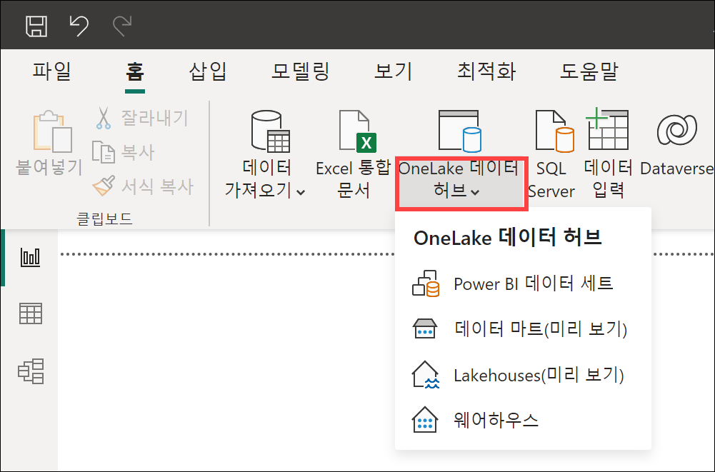 Power BI Desktop의 [홈]에서 [OneLake 데이터 허브]를 확인할 수 있습니다.