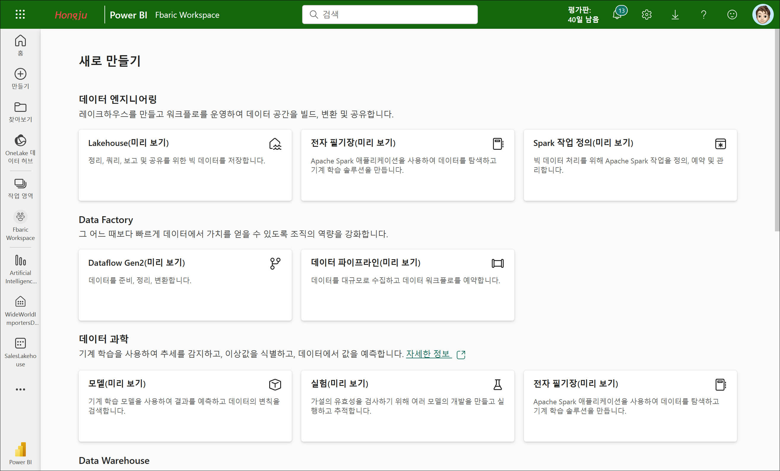 Microsoft Fabric에는 레이크하우스, 노트북, 웨어하우스, 데이터 파이프라인 등 다양한 항목들이 있습니다.