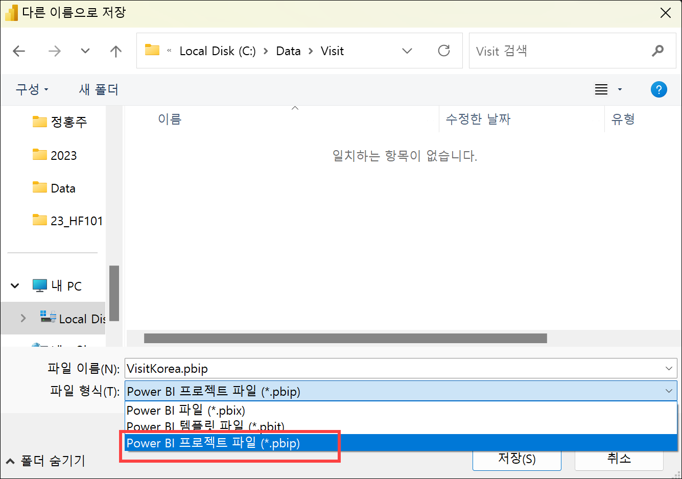먼저 Power BI 프로젝트(.pbip) 저장은 Power BI Desktop에서 저장 시 다른 이름으로 저장에서 Power BI 프로젝트(.pbip)를 선택하면 됩니다.