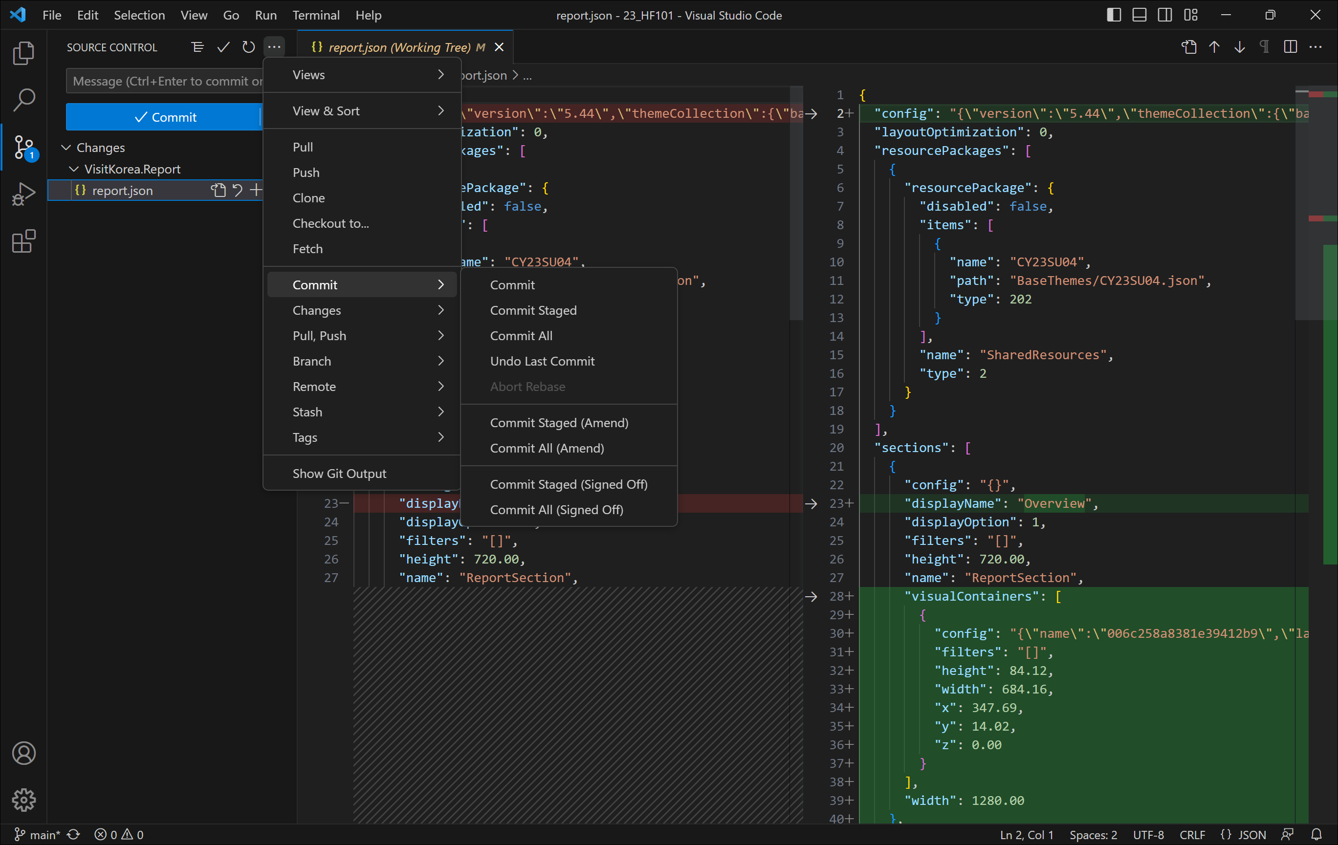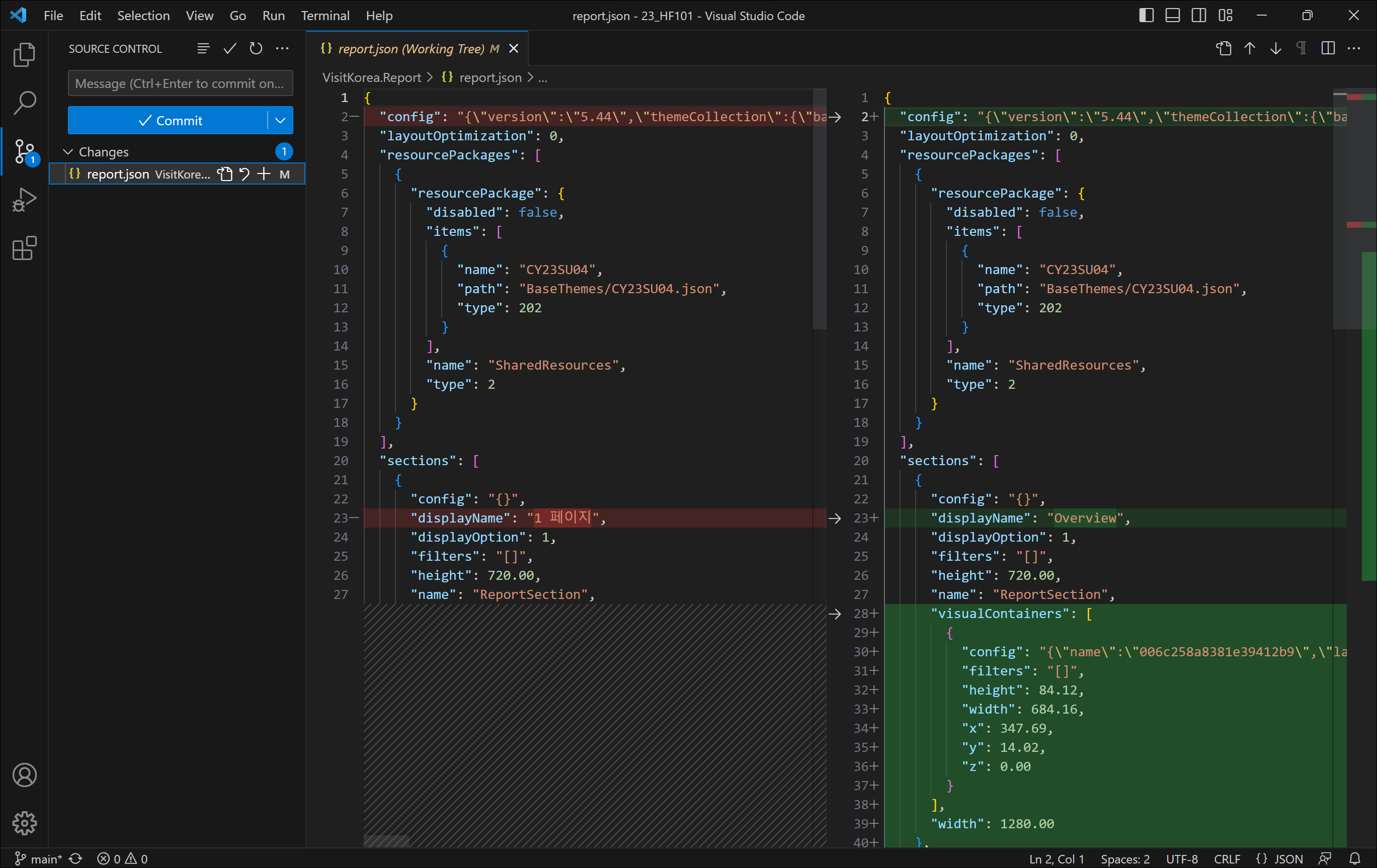 해당 폴더에 Power BI 프로젝트로 저장한후, Power BI Desktop에서 일부 작업을 수행하고 저장을 했습니다. Visual Studio Code에 가보면 변경되었다는 표시가 나타나며 클릭시 변경된 사항을 확인할 수 있습니다.