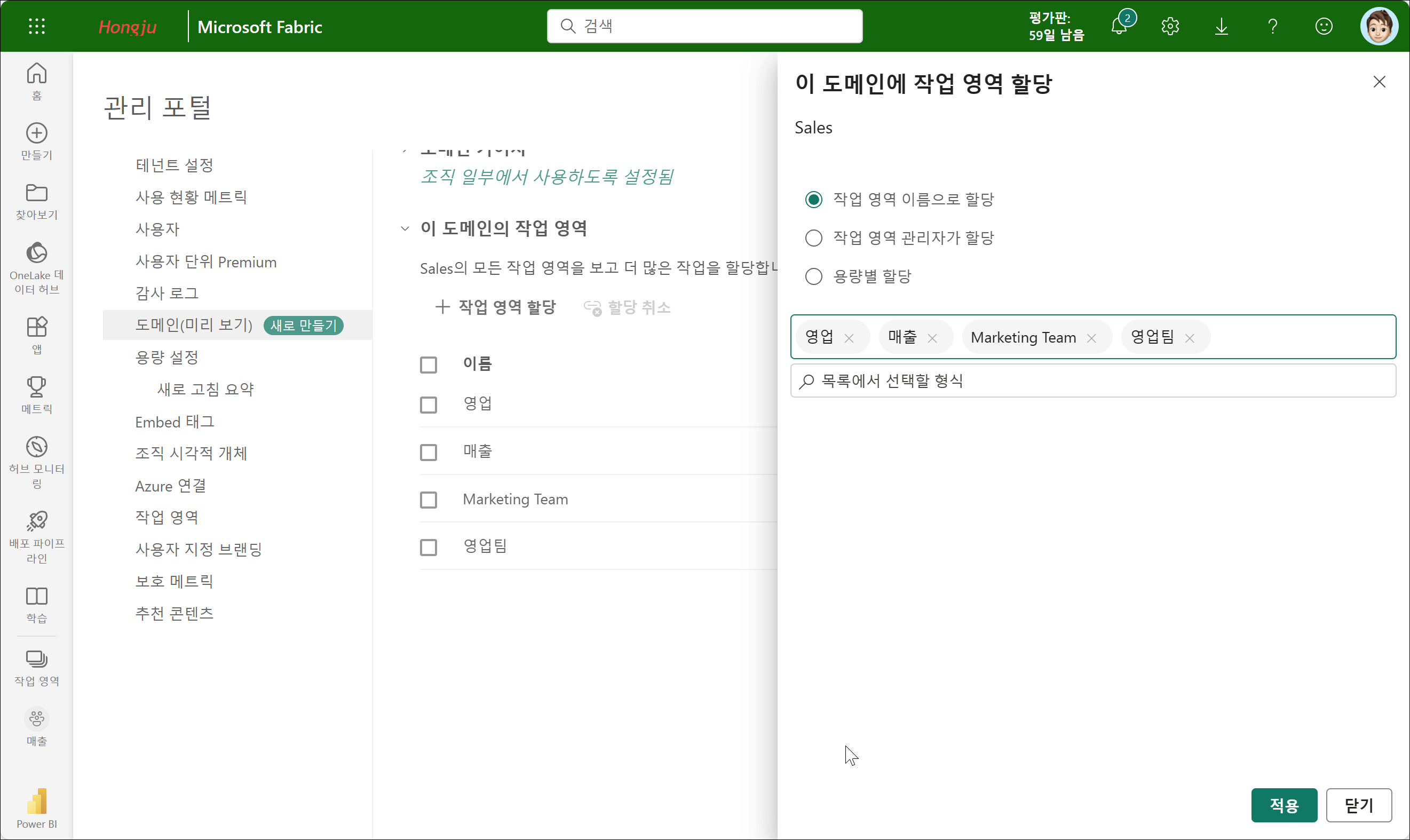 도메인은 Power BI 관리 포털에서 생성하고, 작업 영역을 연결할 수 있습니다. 관리 포털에서 도메인 메뉴를 확인할 수 있고, 도메인을 생성할 수 있습니다.