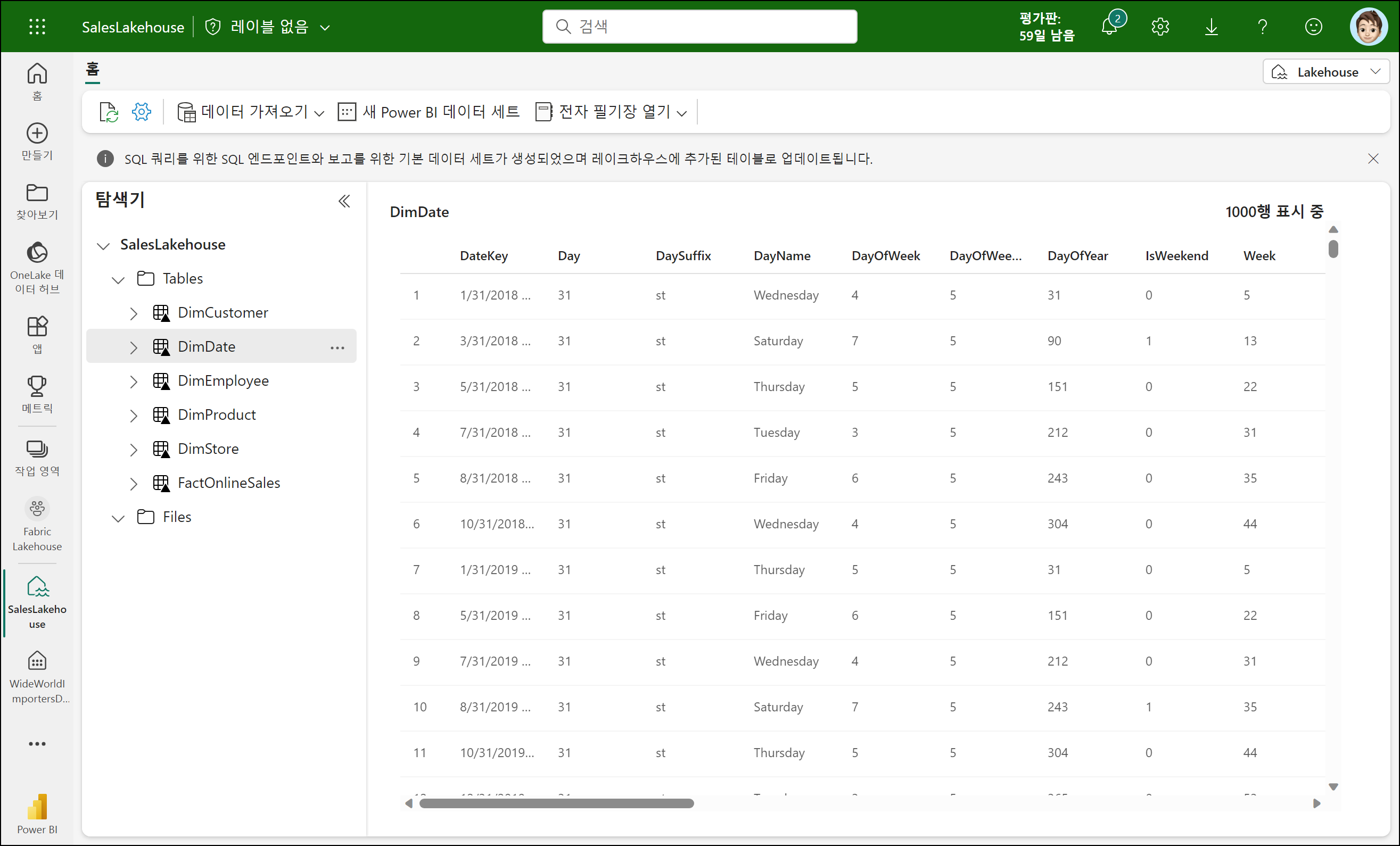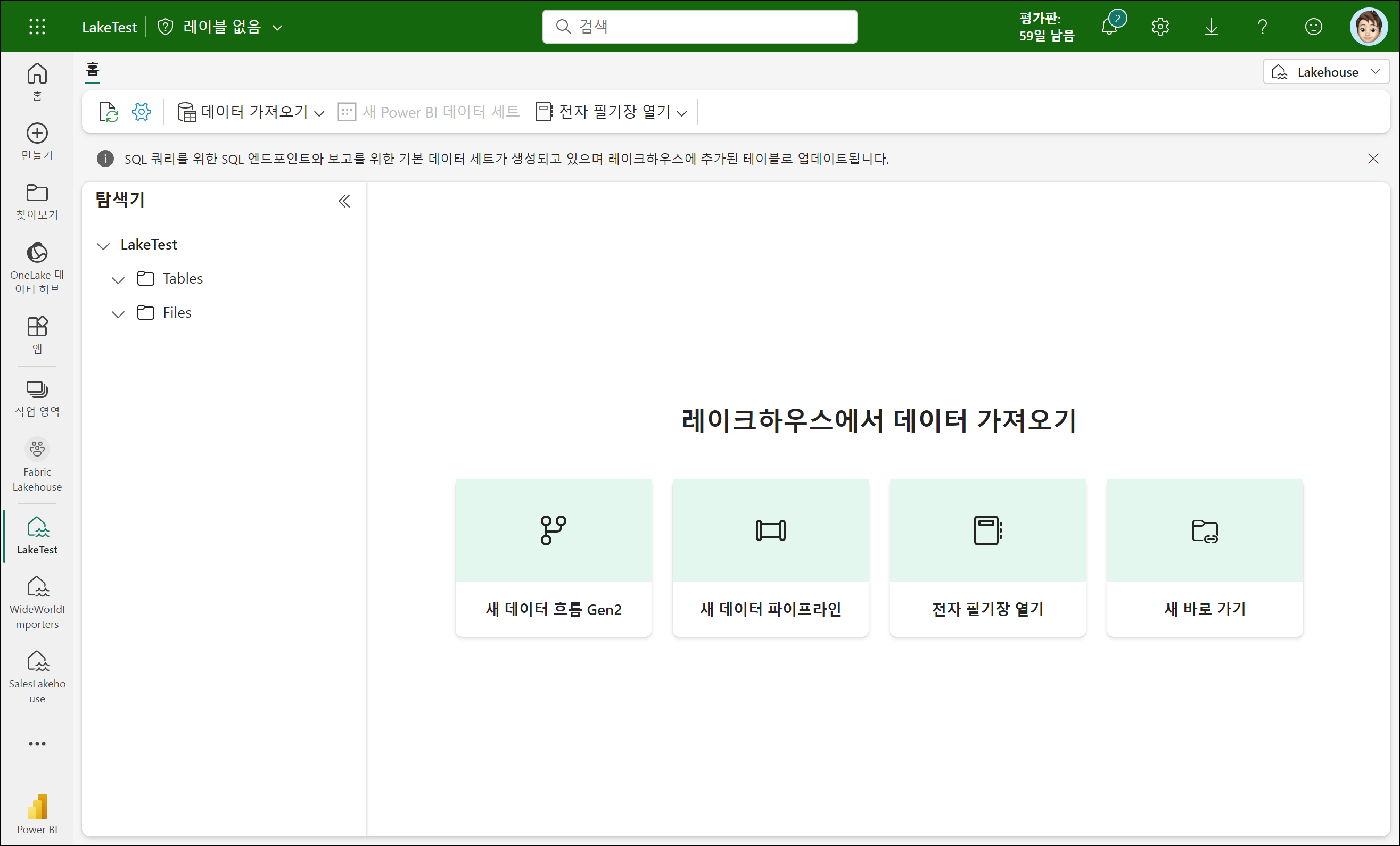 Fabric 작업 영역에서 레이크하우스를 생성하면, 테이블과 파일이 탐색기에서 보입니다.