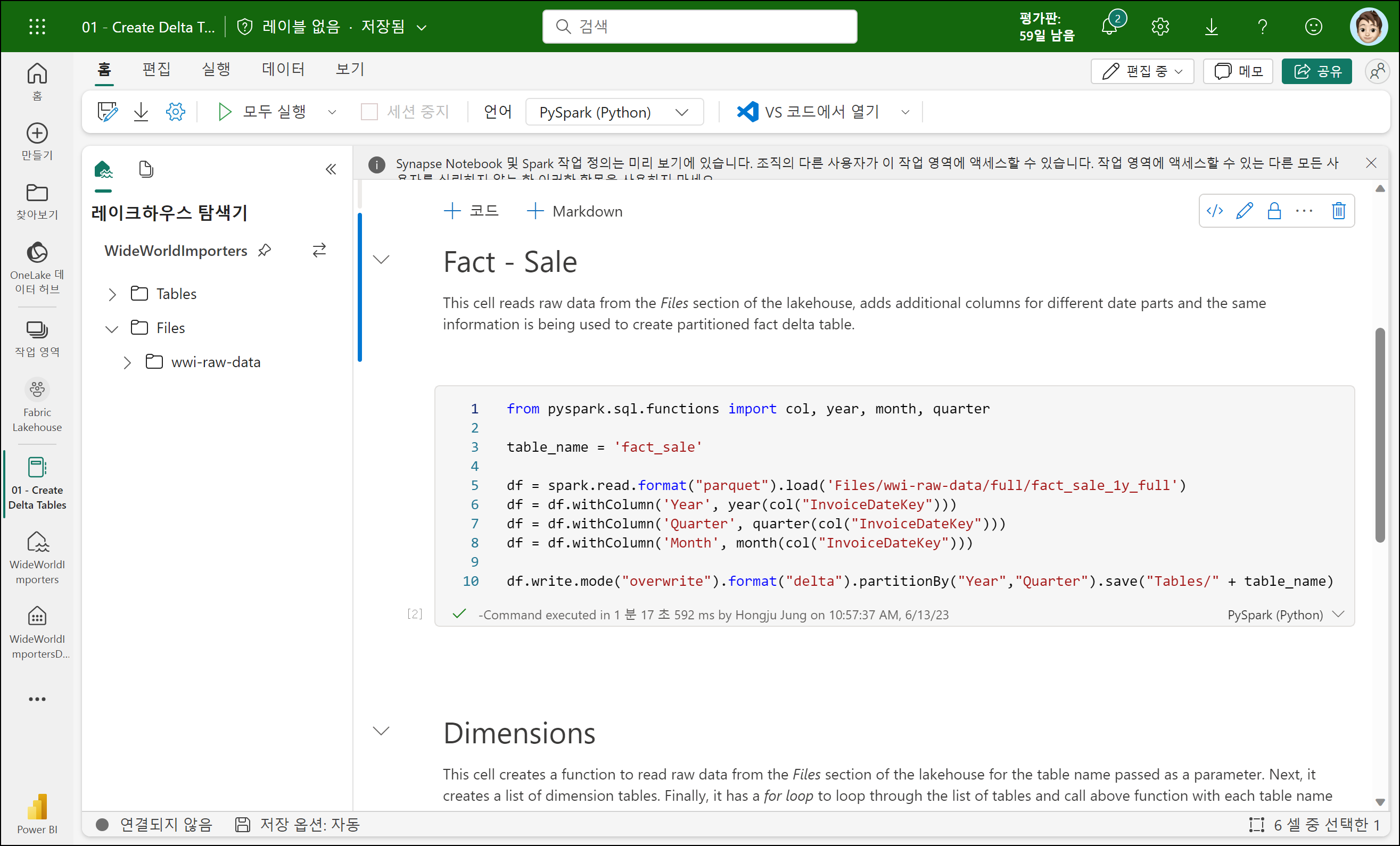 레이크하우스에서는 웨어하우스와 달리 노트북(Notebook)을 통해 Python 코드를 작성하여 데이터를 가져오기 할 수 있습니다.