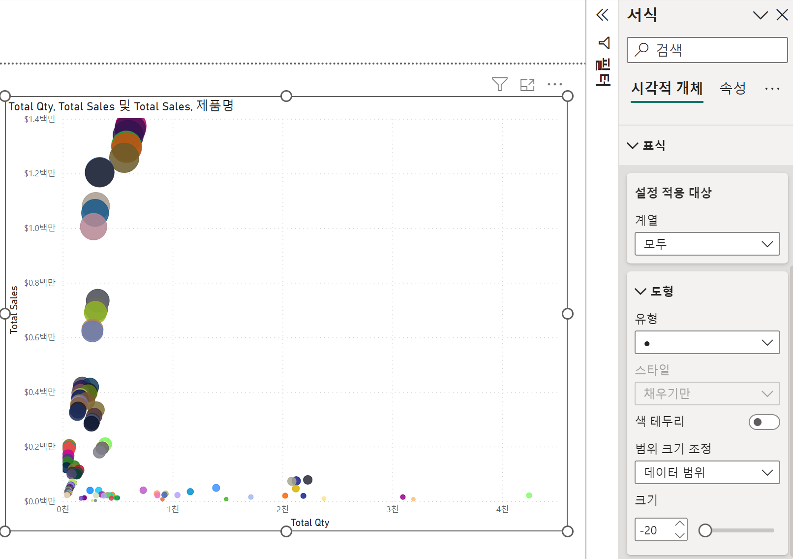 분산형 차트에 크기 항목을 추가한 경우, 표식에서 범위 크기 조정과 크기 속성을 조정할 수 있습니다.