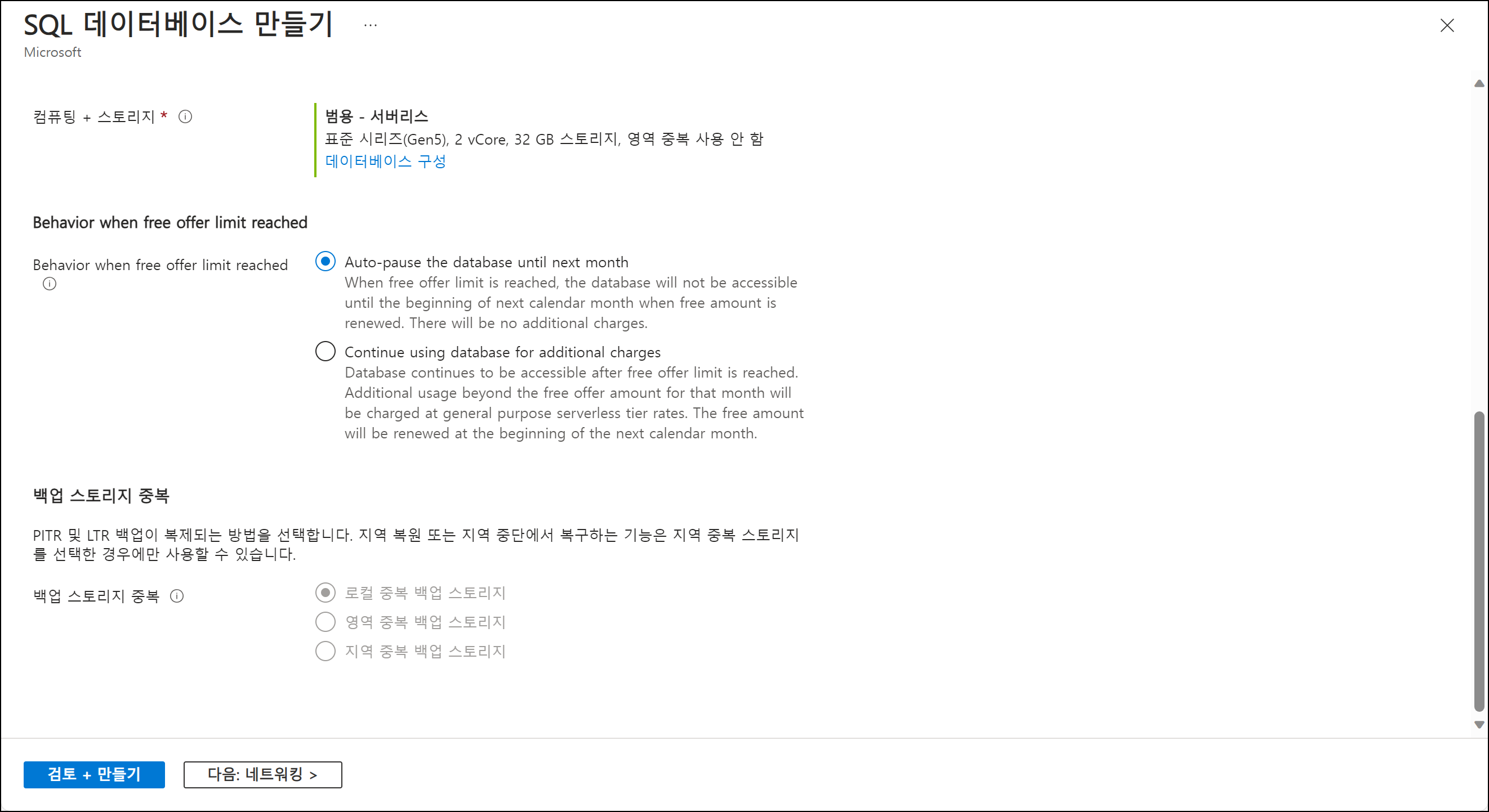 자동 정지(Auto-pause the database until next month) 옵션이 기본적으로 켜져 있습니다. 해당 비용을 다 쓰게 되면 다음달까지 자동으로 정지됩니다. 필요시 추가 비용을 지불하는(Continue using database for additional charges) 옵션을 선택하게 되면 무료 제공 비용 초과시 초과분에 대해 비용이 청구됩니다. 추가 비용을 지불하는 옵션으로 데이터베이스를 생성 후 자동 정리 옵션으로 변경할 수 없습니다.