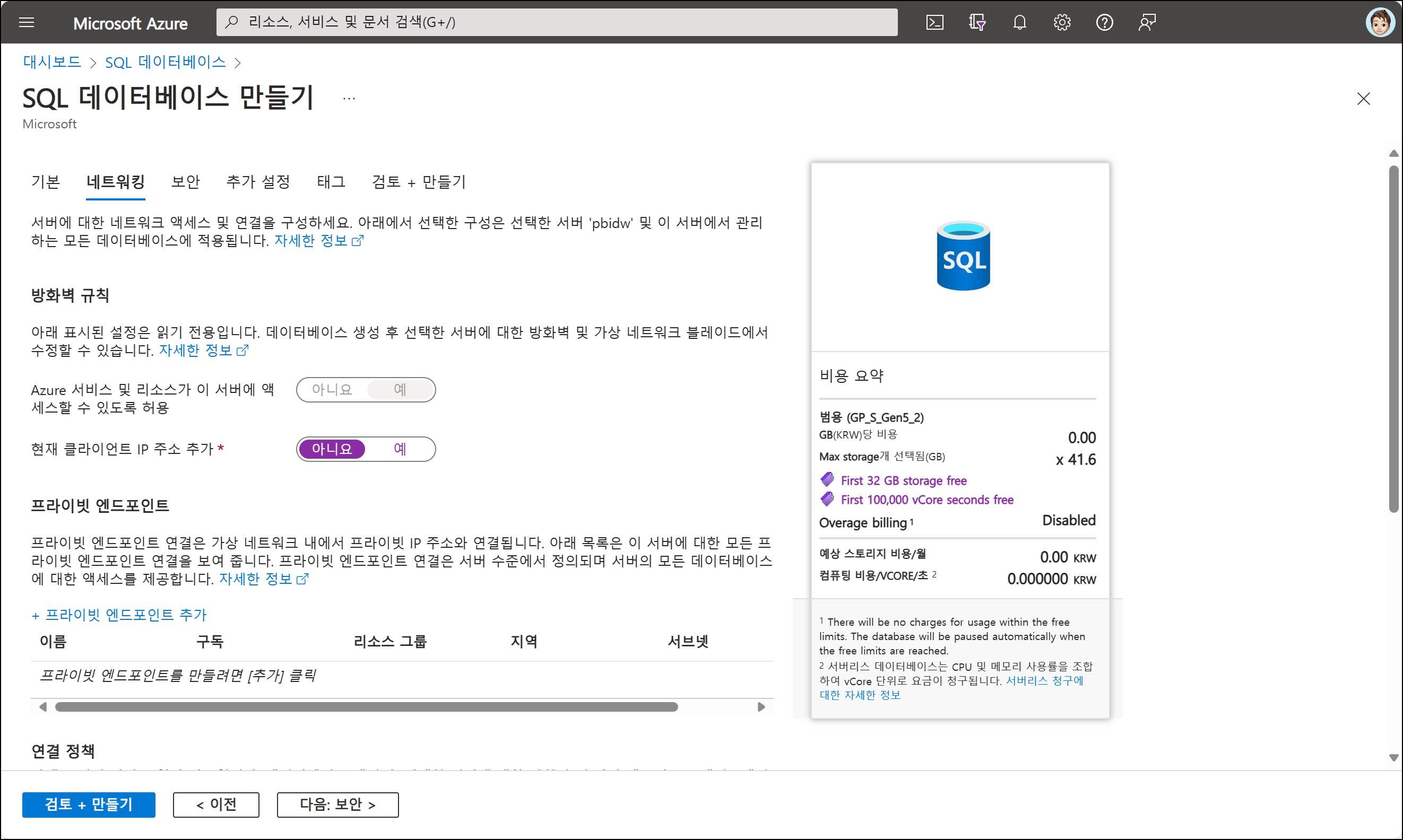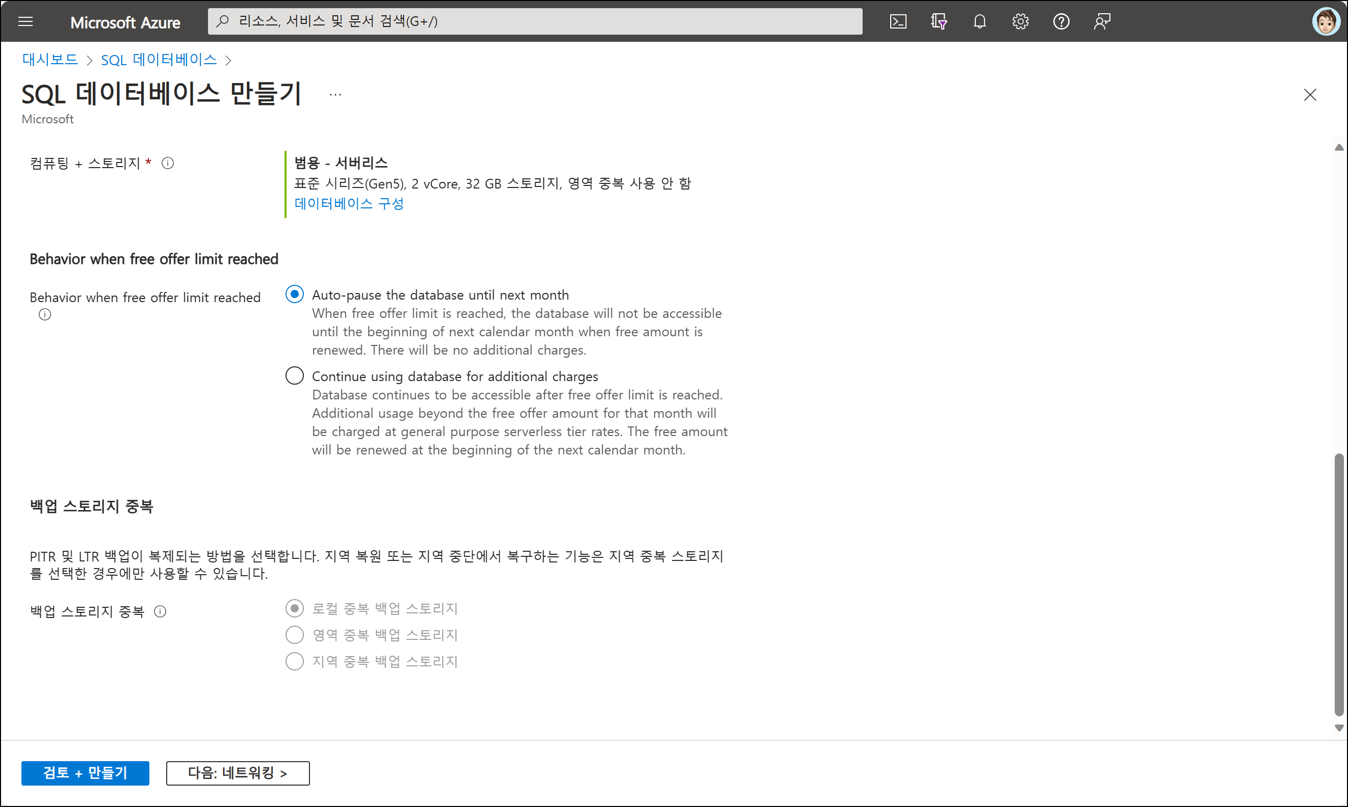 4. 아래에는 비용 청구에 대한 중요한 옵션이 있습니다. [비용 요약]에 해당하는 32GB 스토리지, 100,000 vCore seconds를 초과하는 경우 정지(Auto-pause) 또는 비용 청구(Continue) 옵션을 확인합니다.