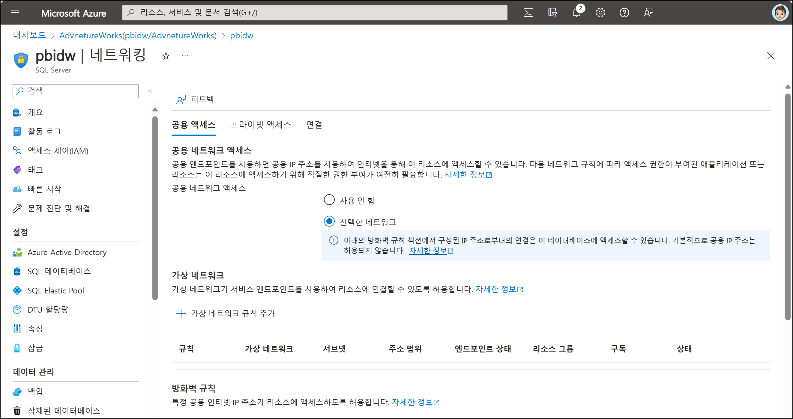 5. 네트워킹 탭에서는 방화벽 또는 프라이빗 엔드포인트를 설정할 수 있습니다. 방화벽은 SQL 데이터베이스 서버를 액세스하는 IP 주소를 지정하여 해당 IP 주소만 접근하도록 설정할 수 있습니다. 방화벽은 데이터베이스 서버 설정에서 추가로 확인, 설정할 수 있습니다. 필요하다면 [현재 클라이언트 IP 주소 추가]를 선택합니다. 프라이빗 엔드포인트는 가상 네트워크 내에서 사설 IP주소와 연결되도록 설정할 수 있습니다. 프라이빗 엔드포인트가 더 보안이 강화된 연결에 해당됩니다. 여기서는 방화벽을 통해 액세스합니다.