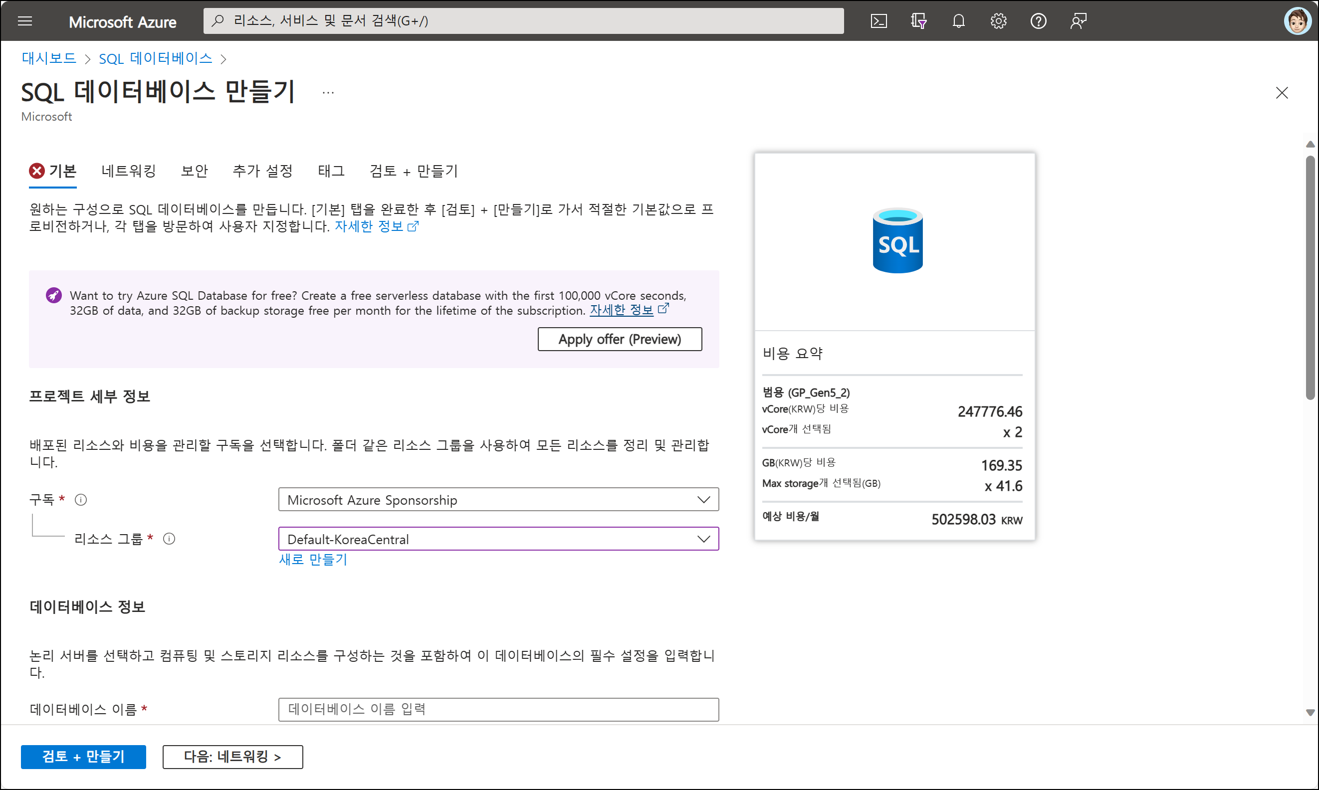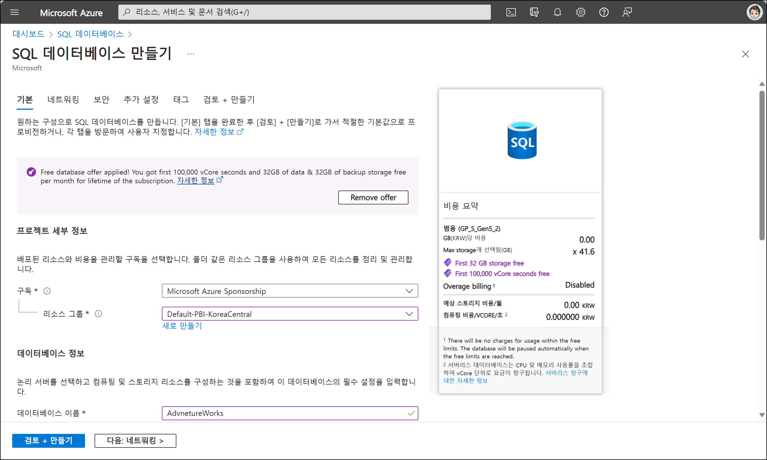 3. [비용 요약]을 확인하고, 구독과 리소스 그룹, 데이터베이스 서버, 데이터베이스 이름을 선택해줍니다. 데이터베이스 서버는 한국지역에 생성하여도 무료 Azure SQL Database를 사용할 수 있습니다. 관리자 계정과 비밀번호는 기억해두어야 합니다.