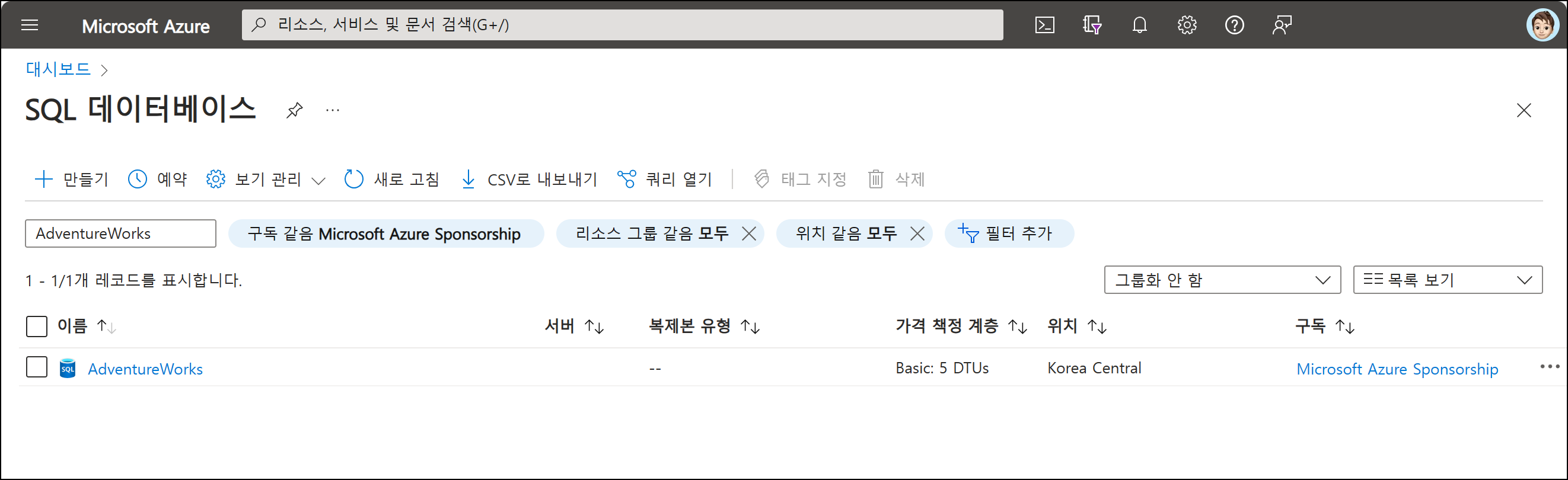 Azure SQL Database FREE - 한국 지역