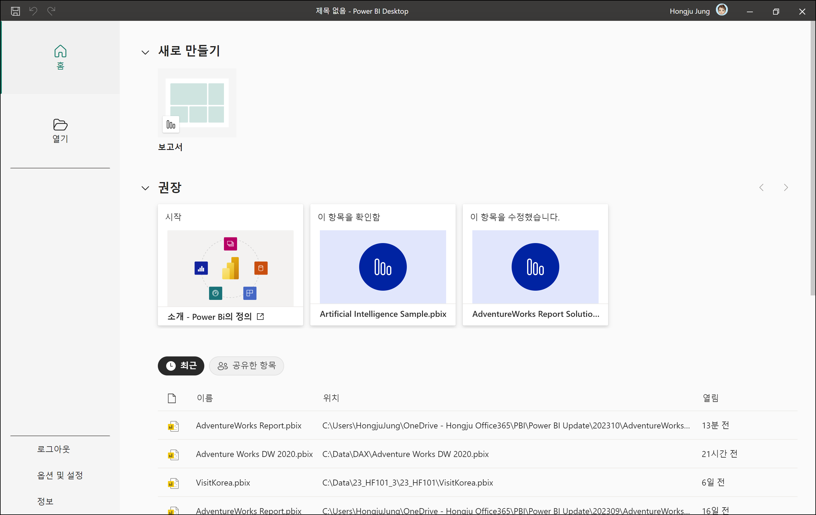 Power BI Desktop 10월 버전의 미리 보기 기능 중 데스크톱의 Power BI 홈을 활성화하였다면, Power BI Desktop을 열면 Power BI 홈과 유사한 화면을 확인할 수 있습니다. 최근 작업 파일 열기, 데이터 가져오기 등을 수행할 수 있습니다.