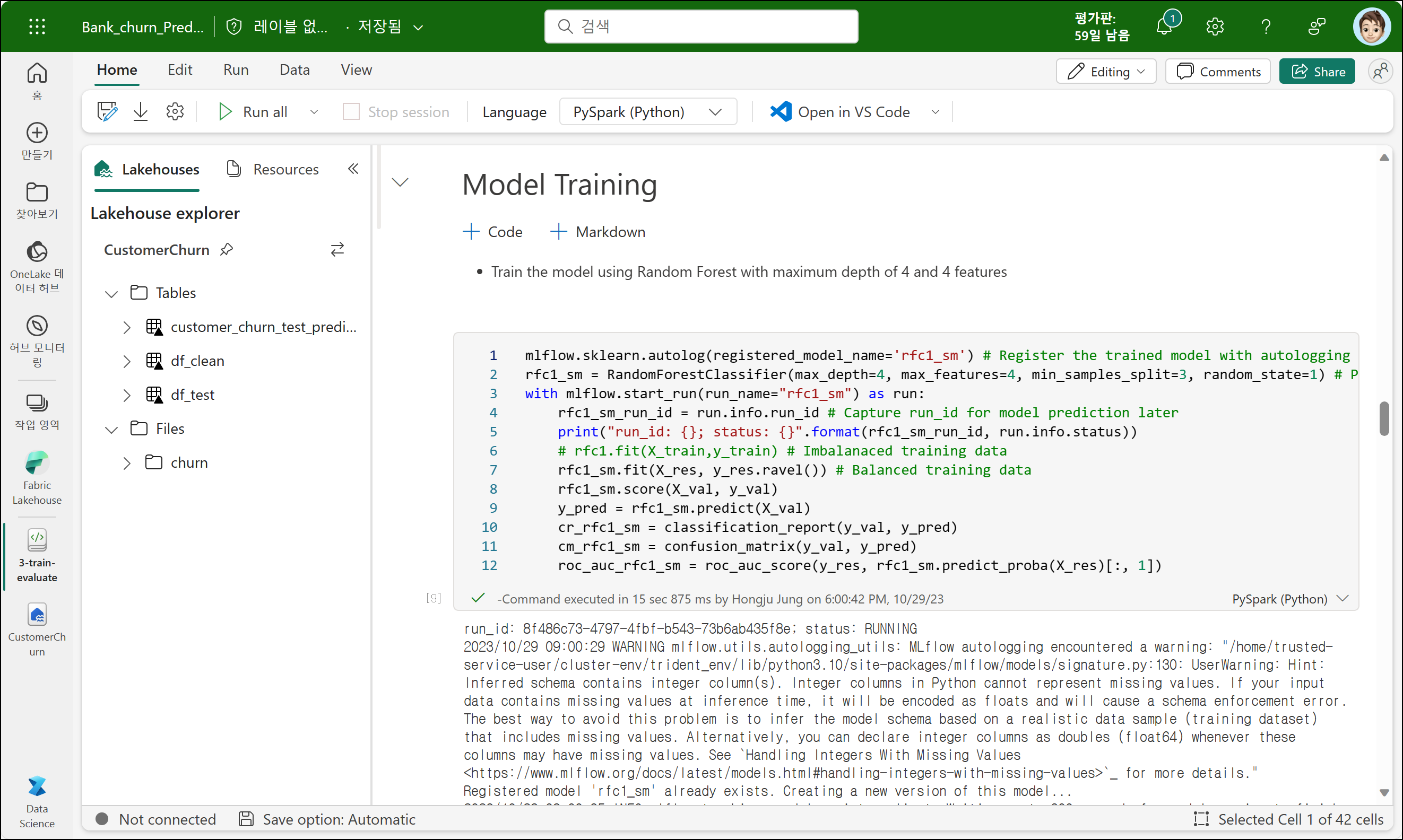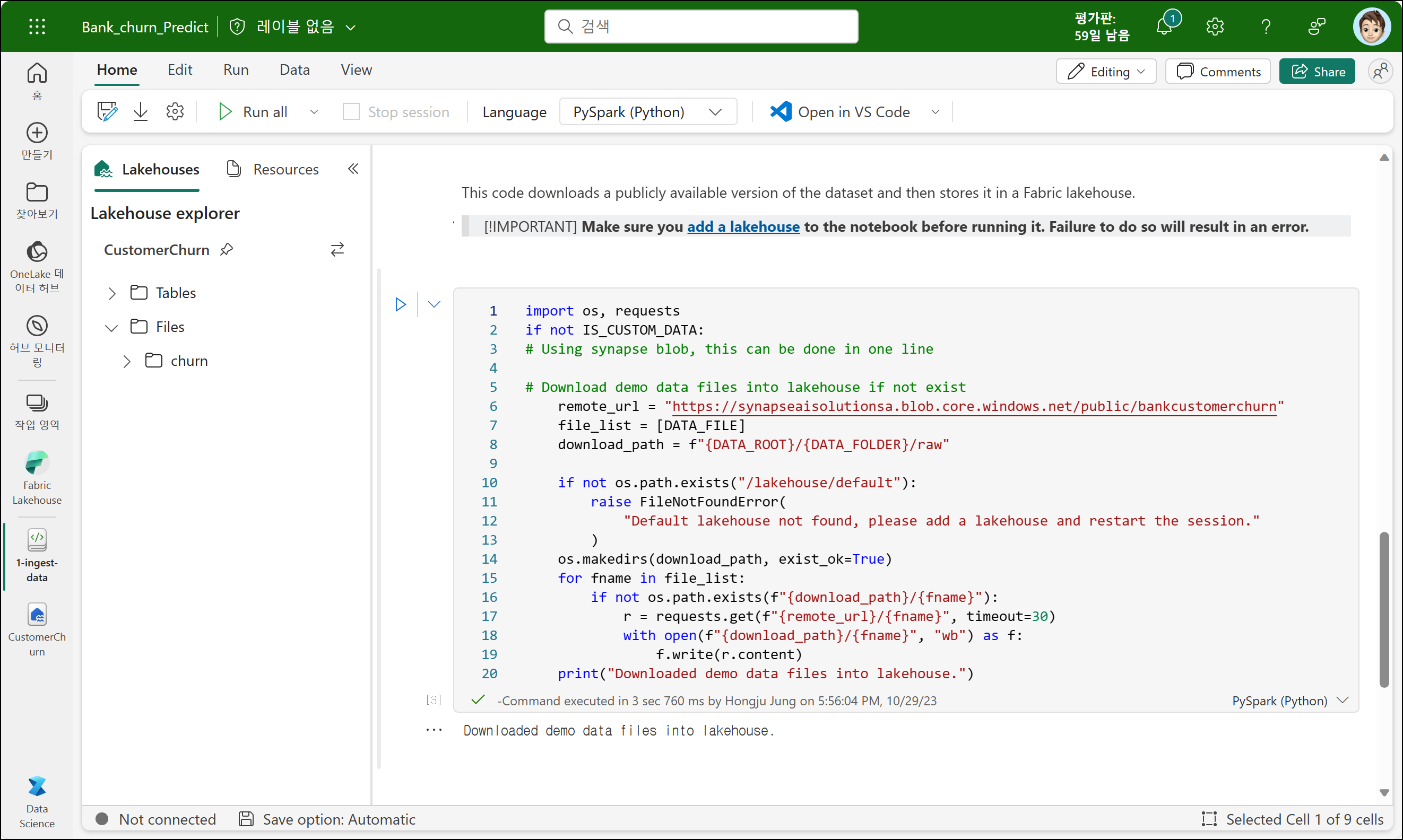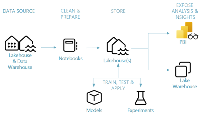 PySpark(Python)가 기본값이며, seaborn numpy pandas 등 라이브러리를 설치하여 데이터를 탐색, 준비, 시각화를 수행할 수 있습니다. 특이한 점은 위 그림에서 보는 것처럼 왼쪽 창에서 Lakehouse를 연결할 수 있다는 것입니다. 데이터를 변환, 시각화, 실험, 학습 등을 수행하기 위해서는 데이터가 필요합니다. 위 링크의 자습서를 설명하기 위한 다이어그램을 확인해보면 이해가 더 빠를 것 같습니다.