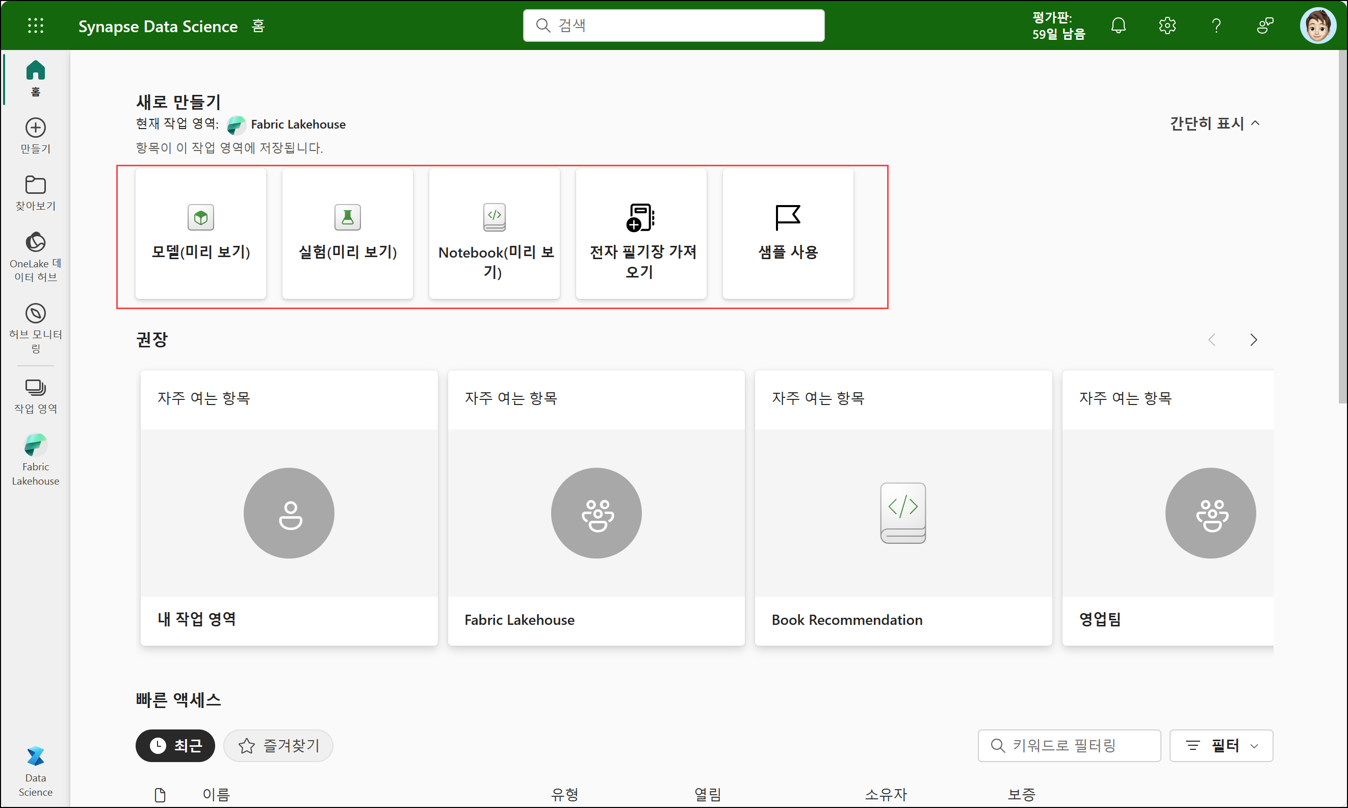 Microsoft Fabric에서 Data Science 홈을 클릭해보면 모델, 실험, 노트북, 샘플을 확인할 수 있습니다.
