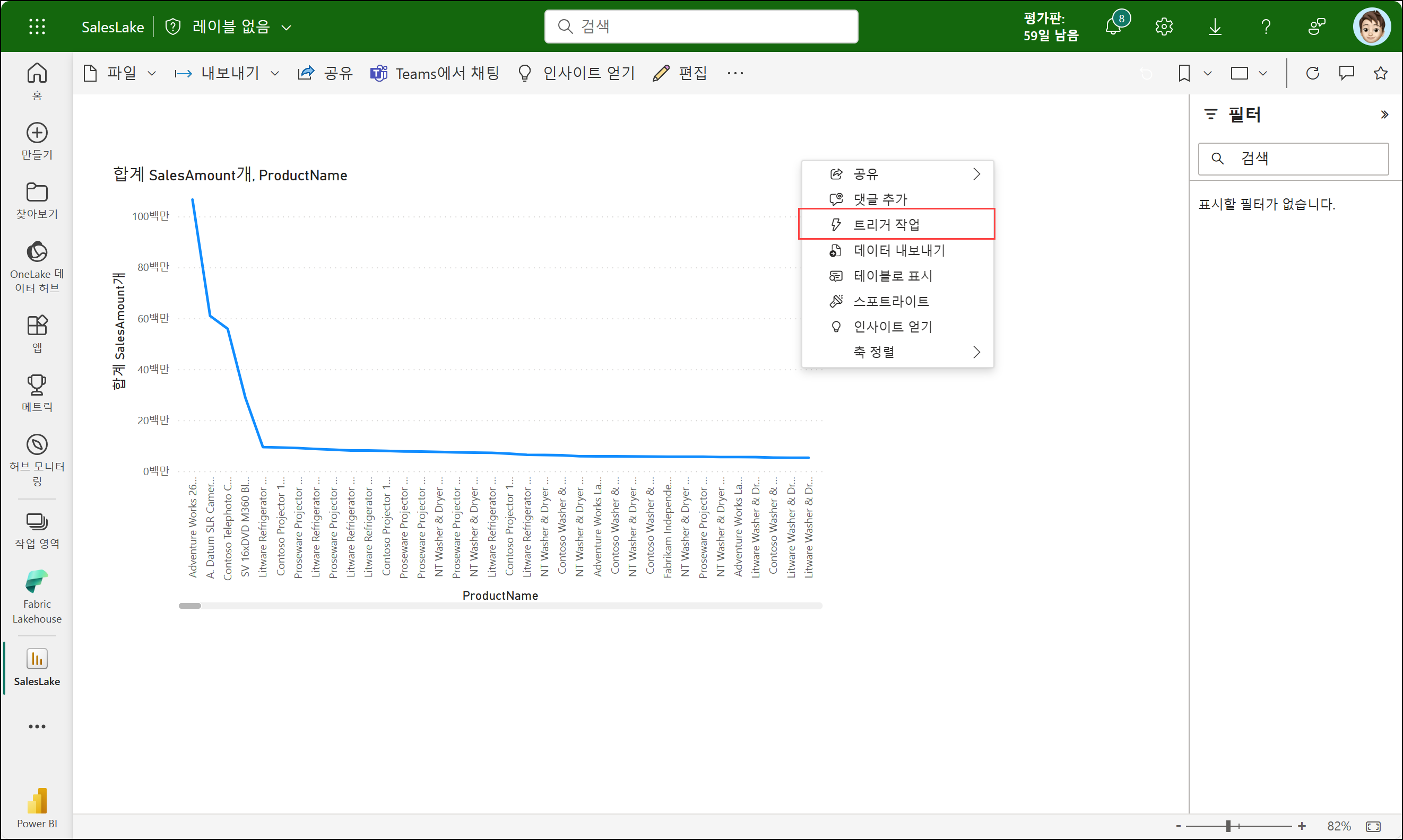 먼저 보고서의 시각적 개체에 마우스를 올려 … 메뉴를 클릭하면 트리거 작업 메뉴를 확인할 수 있습니다.