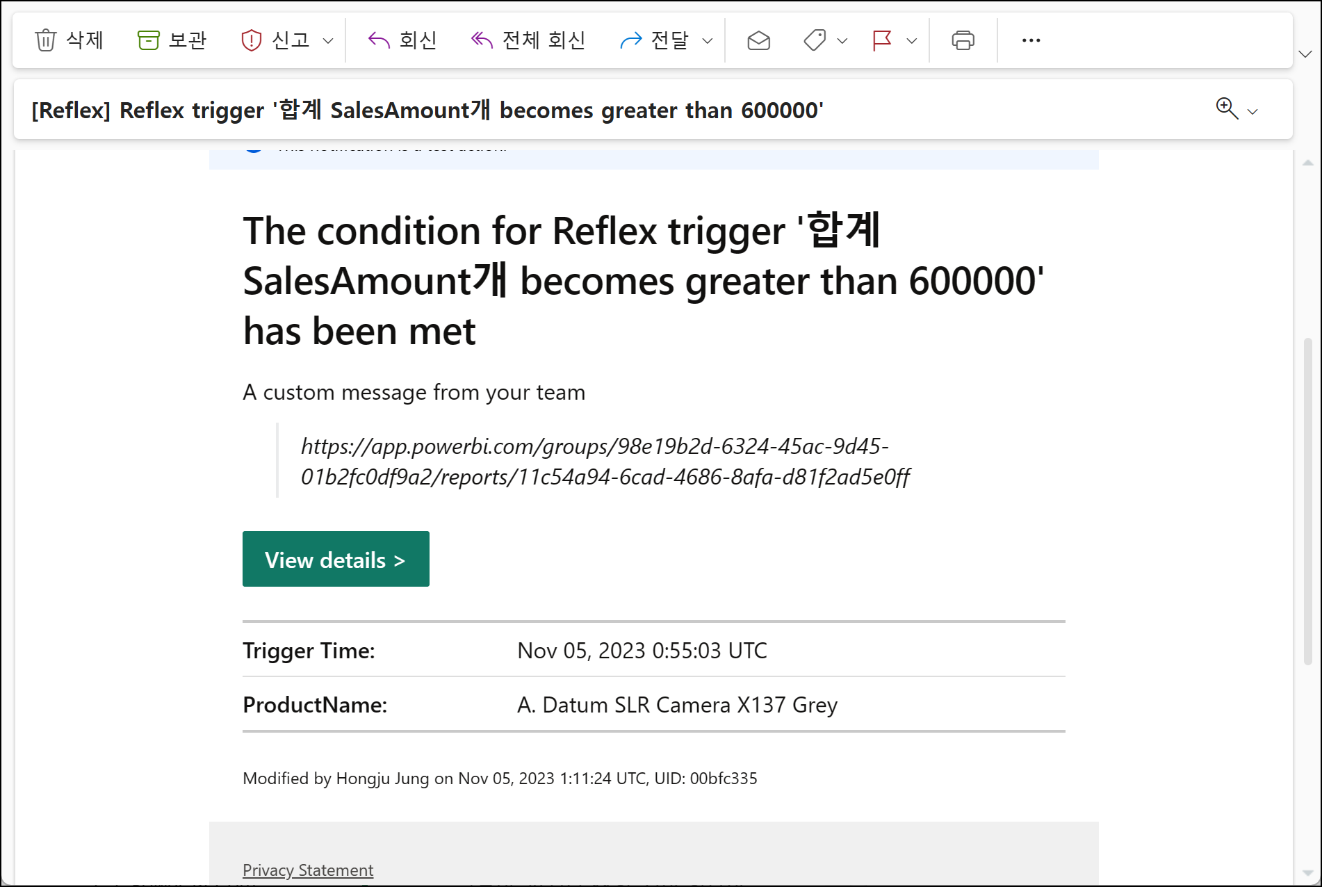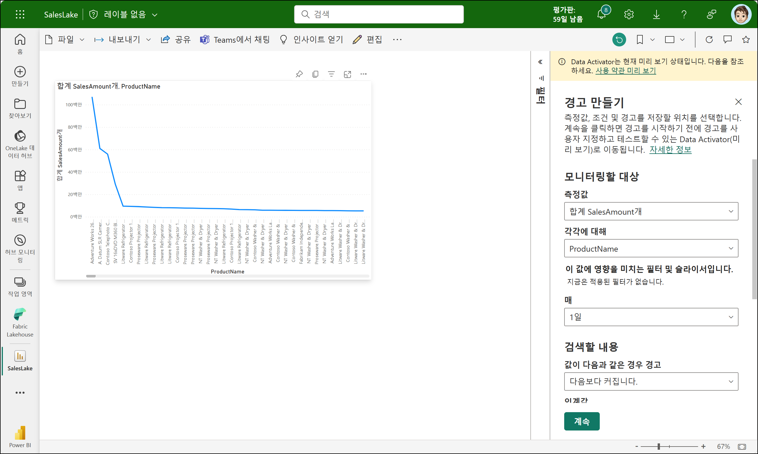 아직 미리 보기 상태이지만, Data Activator의 Reflex 항목을 통해 보고서의 데이터가 변경되면 경고 및 자동화 작업을 트리거하여 알림을 받을 수 있습니다. Power Automate를 이용하지 않고도 경고를 받을 수 있으며, 대시 보드의 카드 시각적 개체를 사용하지 않고 보고서의 시각적 개체를 통해 자동화할 수 있어 더 효과적입니다.