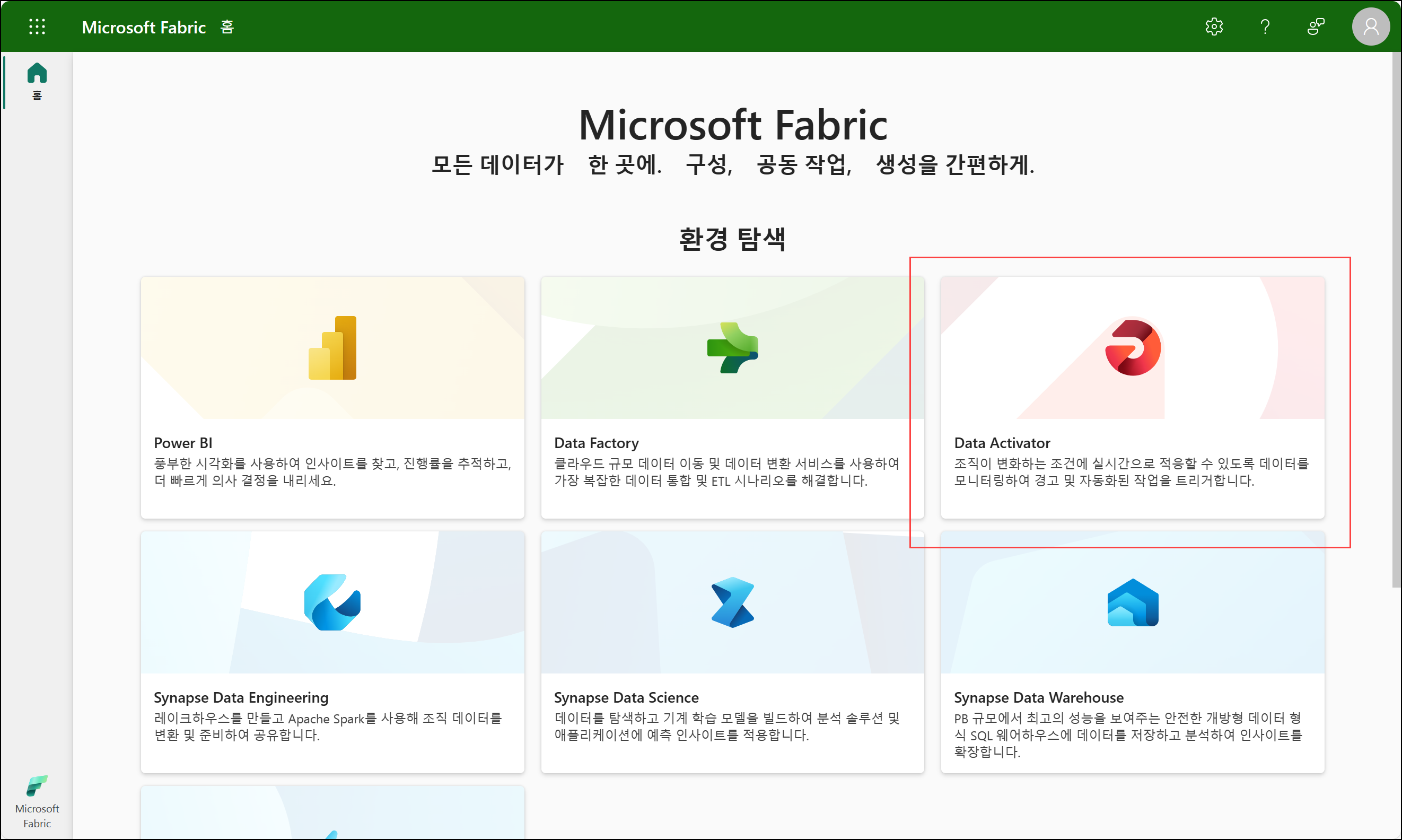 Microsoft Fabric 포털로 이동하면 Data Activator(미리 보기) 확인이 가능합니다. Data Activator는 데이터를 모니터링하여 경고 및 자동화된 작업을 트리거합니다. Power BI 대시보드의 카드 시각적 개체에서는 경고를 생성할 수 있었는데, Data Activator는 보고서의 시각적 개체에 트리거 작업을 연결 가능하며 Power Automate, Teams 메시지, 이메일 등으로 알릴 수 있습니다.