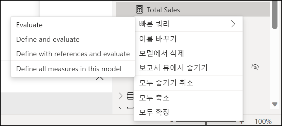 또한 기존 측정값을 오른쪽 클릭하면, [빠른 쿼리]에서 EVALUATE, DEFINE and EVALUATE 등을 통해 기존 측정값을 확인하고 수정하면서 바로 모델에 업데이트가 가능합니다.
