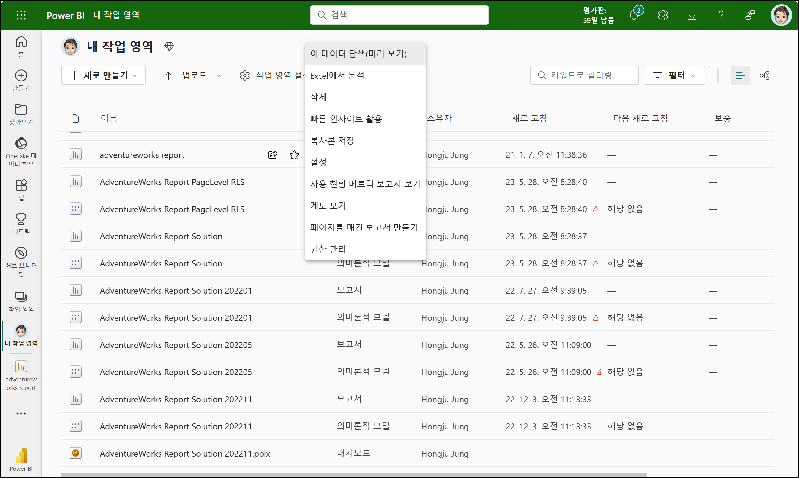 Power BI 서비스의 작업 영역 리스트에서 확인해보면 데이터 세트의 이름이 변경되어 ‘의미론적 모델’로 표시되는 것을 확인해볼 수 있습니다.