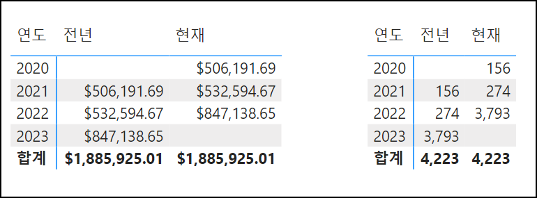 전년도와 현재년도 계산 항목을 생성하고, 판매액과 판매수량 합계 측정값을 시각화보겠습니다.