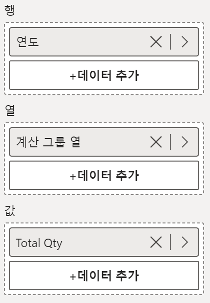 오른쪽은 판매액, 왼쪽은 판매수량입니다 (2023년 판매 데이터는 1월만 있어 현재값이 비어 있습니다) 값 부분에 원하는 측정값만 추가하면 원하는 측정값의 전년도와 현재년도를 시각화할 수 있습니다.