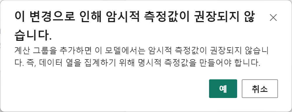 계산 그룹을 생성해서 자세히 알아보겠습니다. 제일 처음 계산 그룹을 생성하게 되면 먼저 암시적 측정값이 권장되지 않는다는 대화상자가 나타납니다. 암시적 측정값은 Sales Amount라는 필드를 막대그래프의 값에 끌어다 놓으면 자동으로 합계가 만들어지는 것을 말합니다. 계산 그룹을 생성하게 되면 Sales Amount 라는 숫자 필드를 사용하지 말고 합계 측정값을 생성하여 사용해야 합니다.