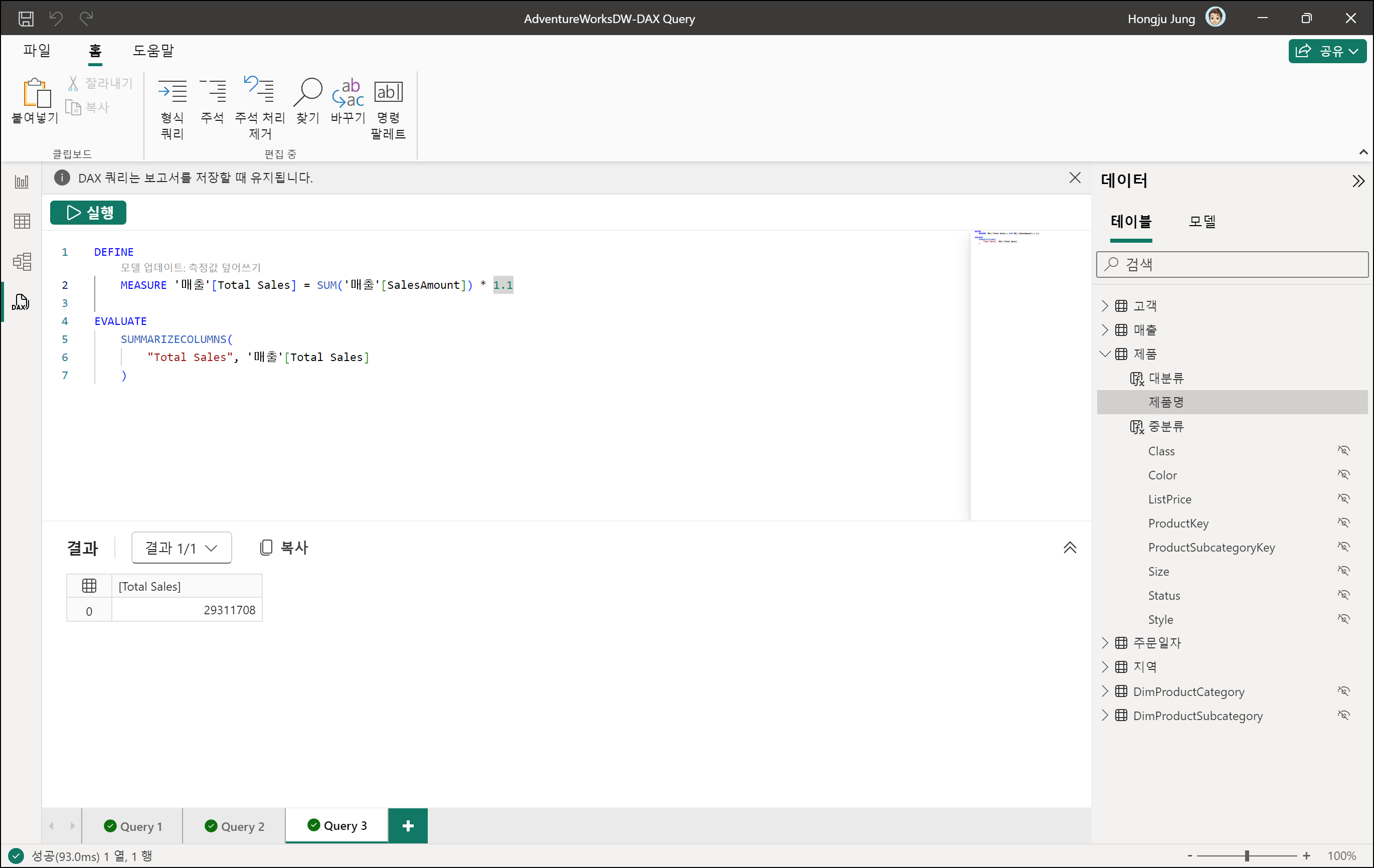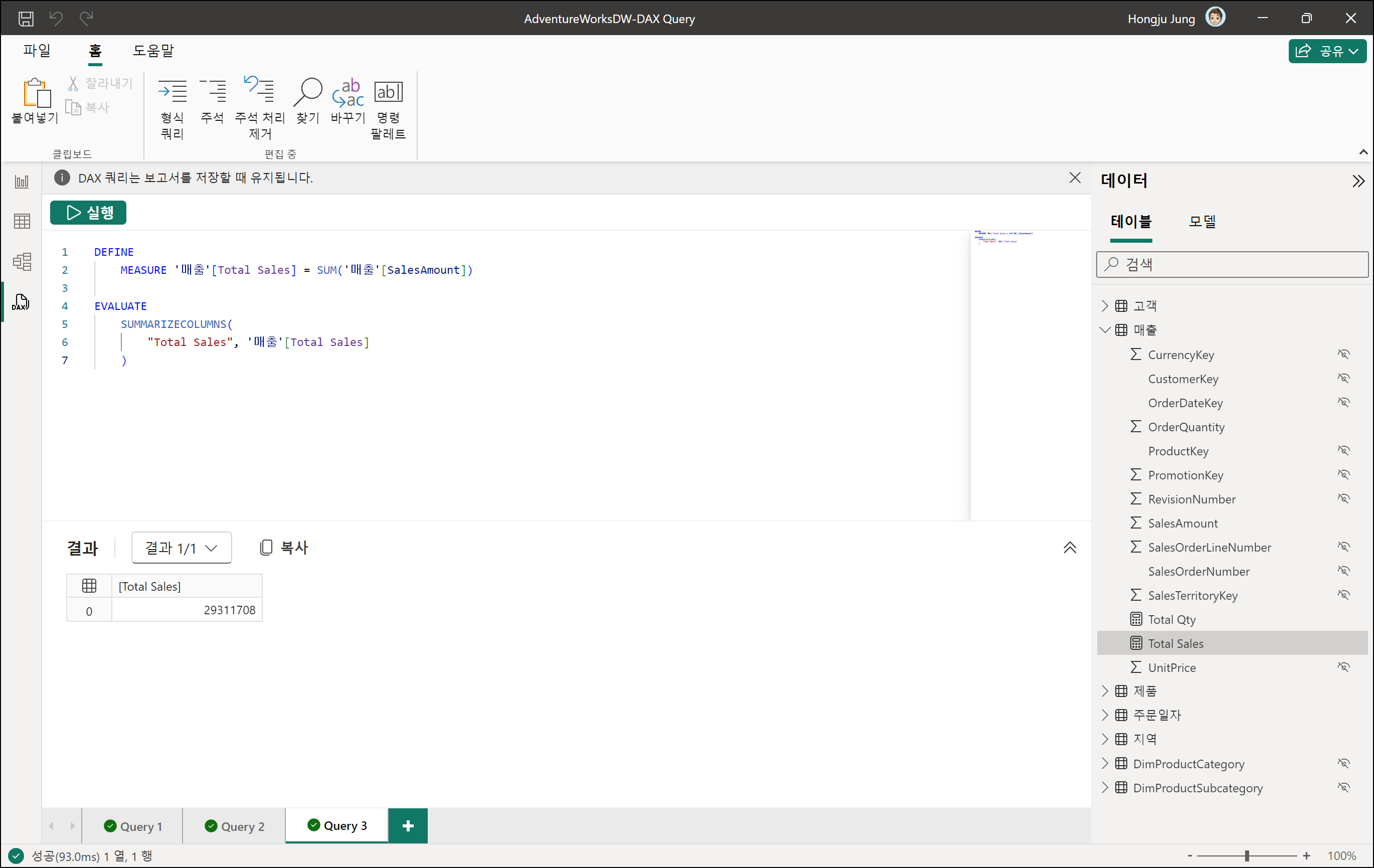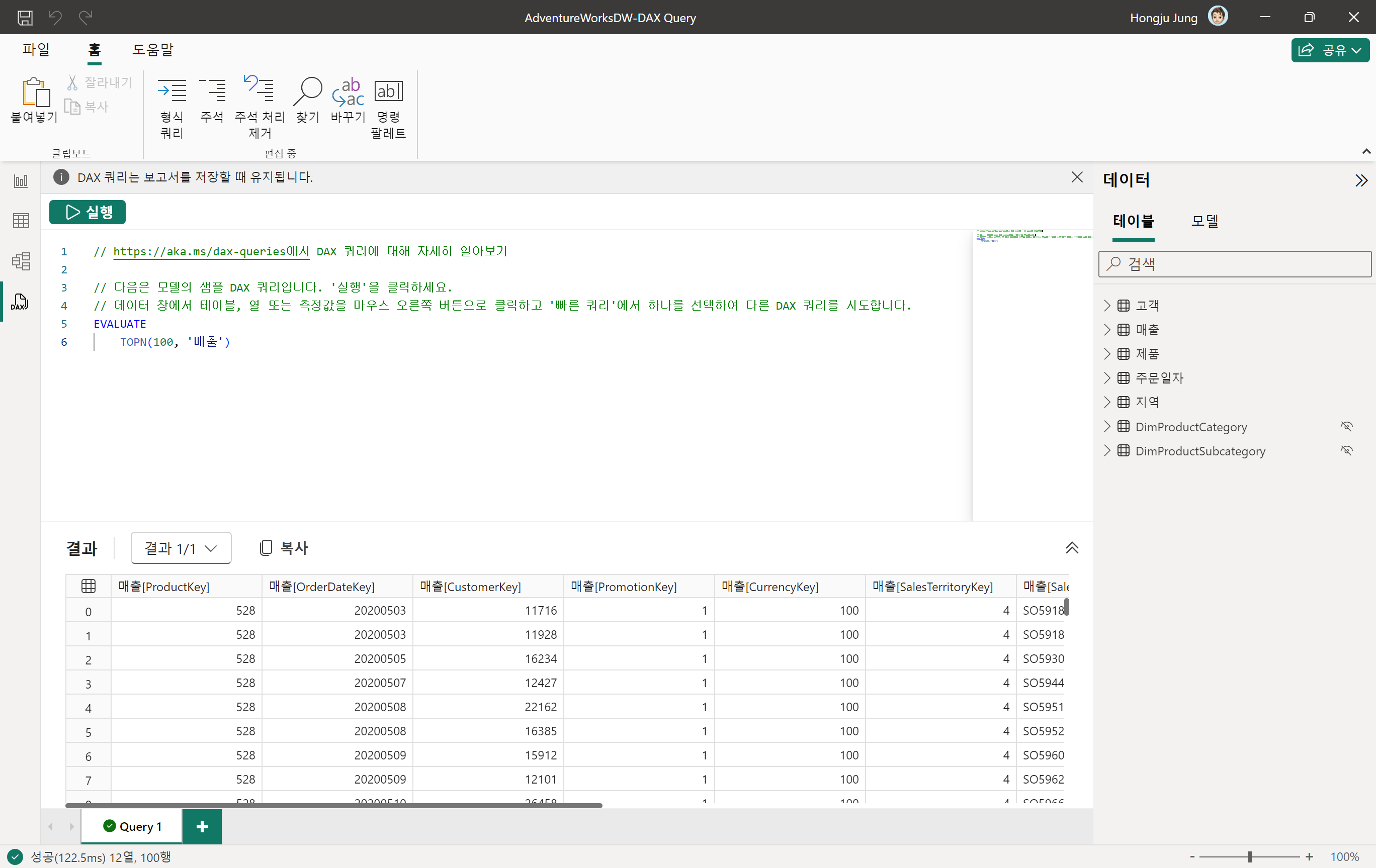 데이터를 가져오고, 측정값을 생성한 후 [DAX 쿼리 보기]를 클릭하면 아래 그림과 같이 샘플 쿼리가 추가되어 있는 쿼리 창을 확인할 수 있습니다. 쿼리 창을 저장하게 되면, 나중에 Power BI Desktop을 열게 되면 다시 해당 쿼리 창을 확인할 수 있습니다.