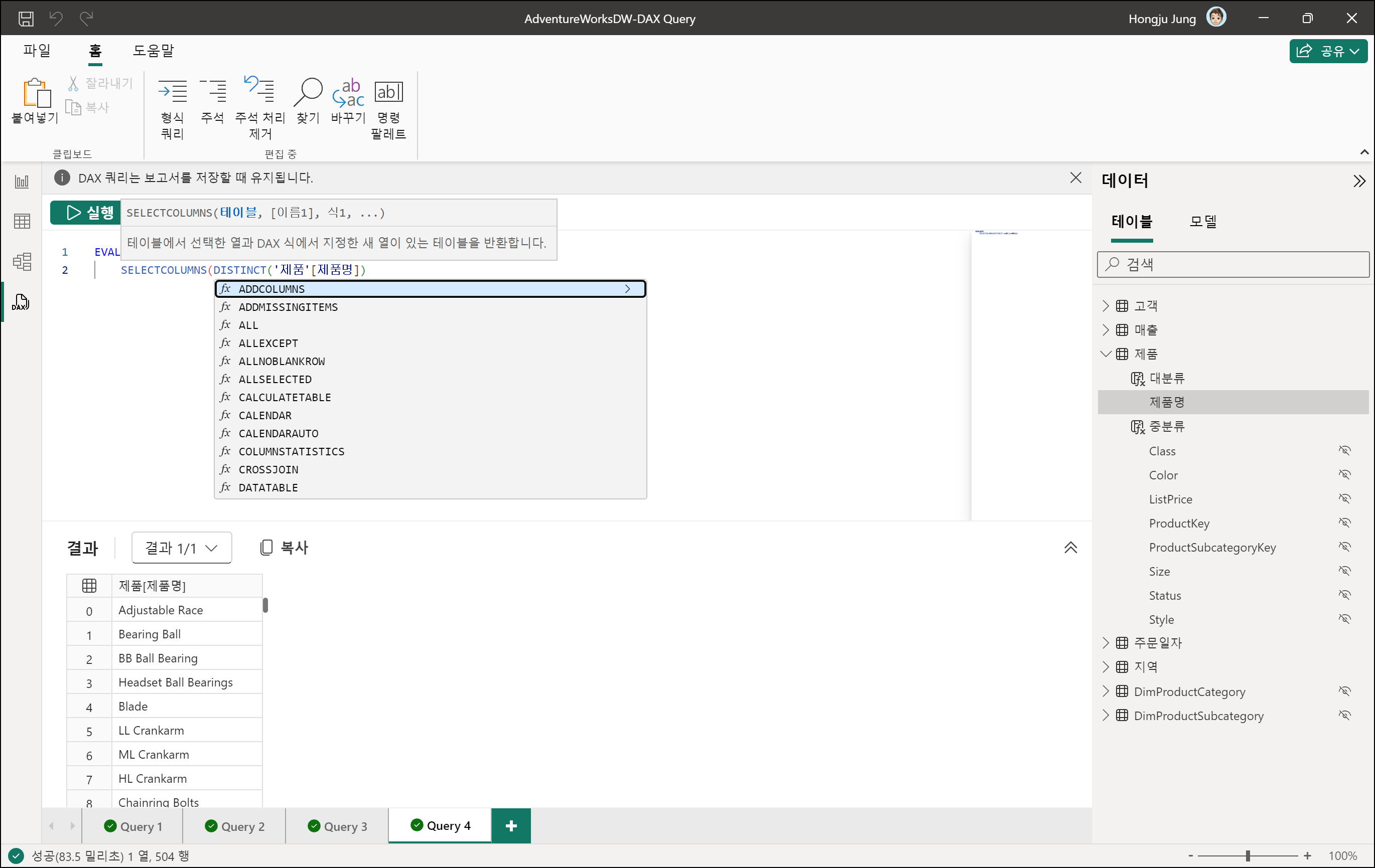 쿼리 창에서는 함수 설명과 인텔리센스로 쿼리 작업을 도와주고 있습니다.