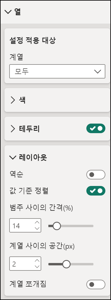 추가된 막대형 차트의 여러 서식 옵션으로 막대형 차트의 스타일을 지정할 수 있습니다. 누적 막대형 차트를 예로 들어 설명하면, 서식의 열에서 계열 모두 또는 각 계열에 색, 테두리, 레이아웃을 지정할 수 있습니다. 색에서는 색, 투명도를 지정하고 테두리에서는 색, 투명도, 너비를 세부적으로 지정할 수 있습니다. 계열 모두에 대해서 레이아웃에서는 역순, 값 기준 정렬, 범주 사이의 간격, 계열 사이의 공간을 지정할 수 있습니다.