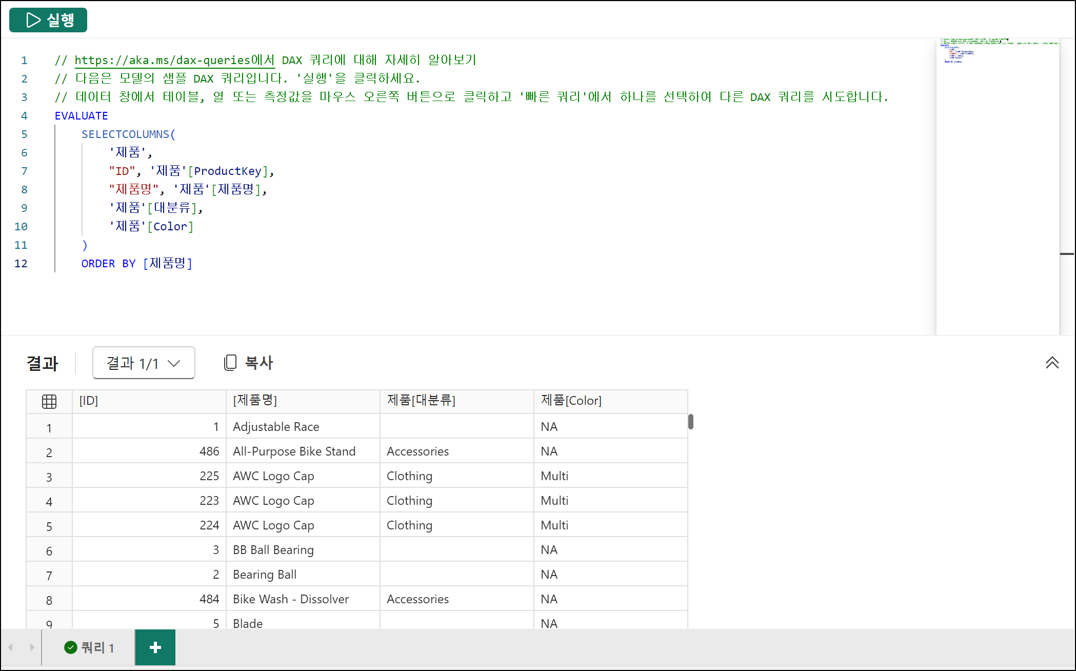 제품 테이블의 모든 열이 아닌 일부 열만 조회하려면 SELECTCOLUMNS을 아래와 같은 방식으로 사용하면 됩니다.