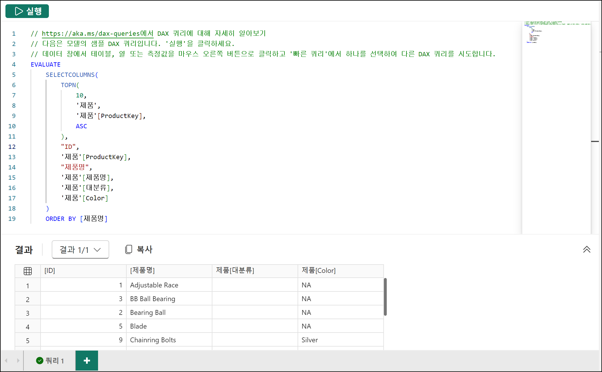 위 구문에서 다른 테이블의 측정값이나 열을 추가하여 조회할 수는 없습니다. 전체 제품이 나오므로 제품ID 정렬된 상위 10개 제품만 보이게 하고 싶을때는 TOPN 함수를 사용하면 됩니다.