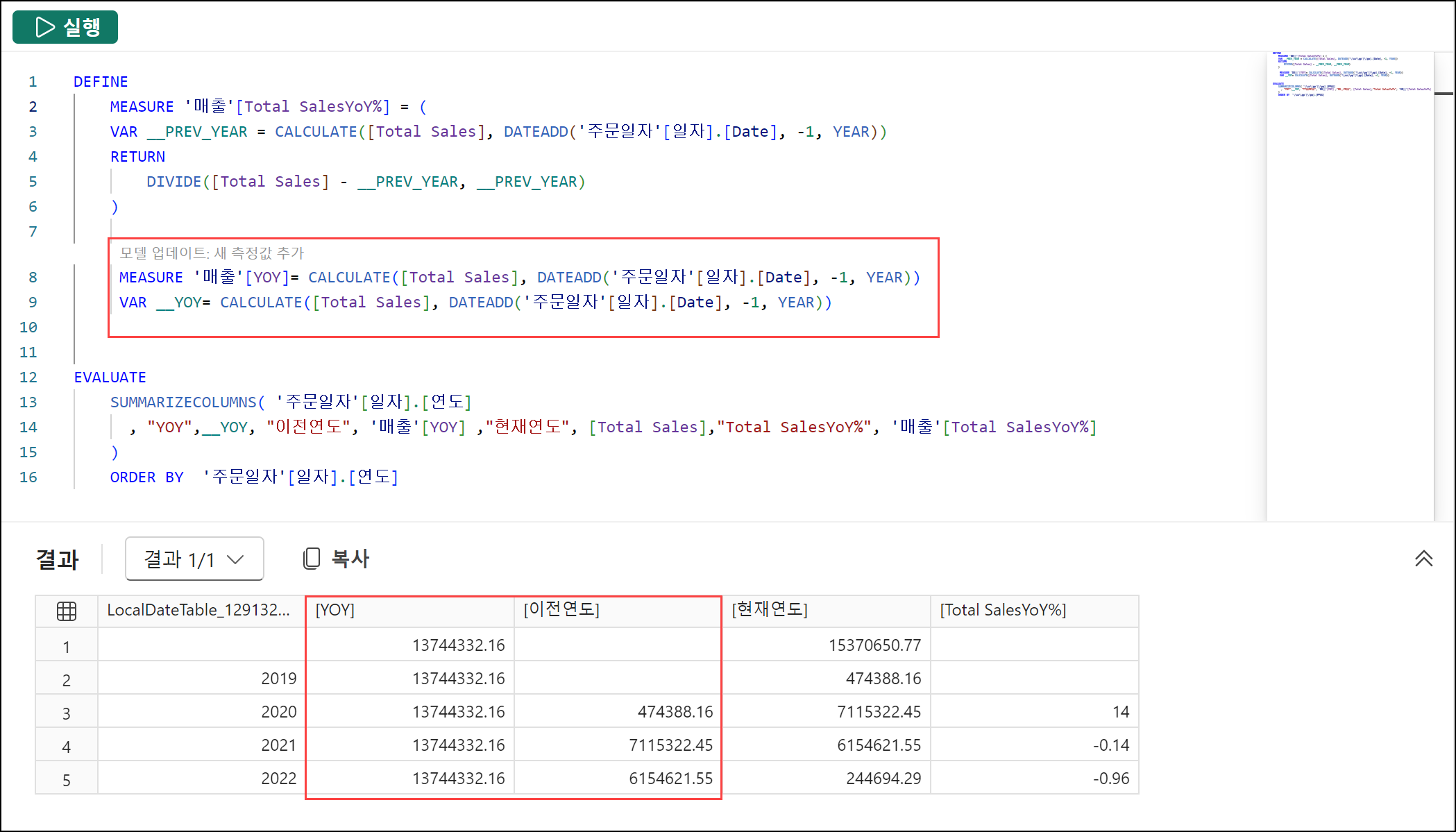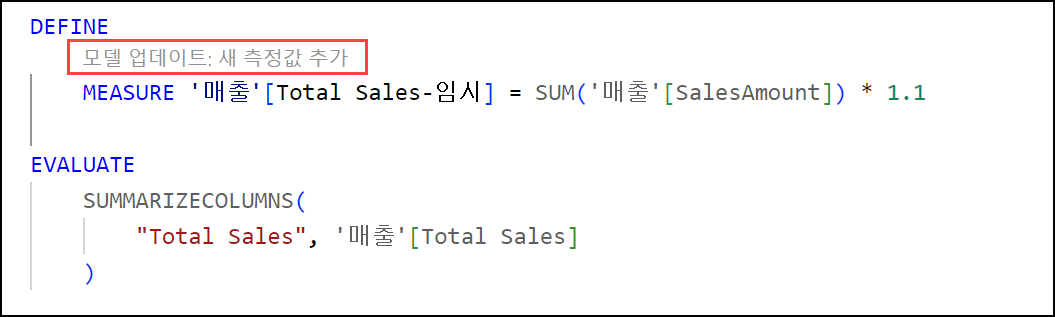 DEFINE 영역에서 새로운 측정값 이름으로 변경하게 되면, ‘새 측정값 추가’ CodeLens를 통해 DAX 쿼리 보기에서 새 측정값을 생성할 수 있습니다.