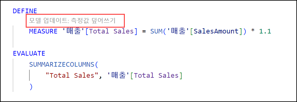DEFINE 영역에서 기존 측정값의 수식을 변경하면, ‘측정값 덮어쓰기’ CodeLens를 통해 기존 측정값을 업데이트할 수 있습니다.
