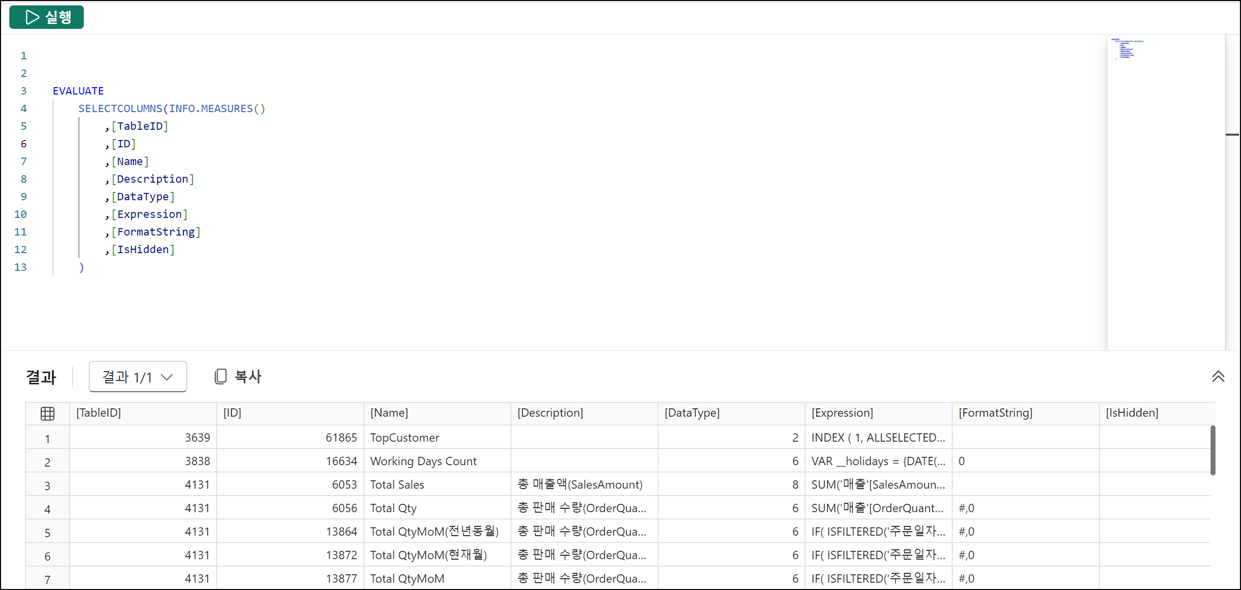 필요하다면, 필터함수, 테이블과 조인 등을 수행하여 결과를 표시할 수 있습니다. 제가 작업하고 있는 모델에서 측정값을 한번 확인해보겠습니다. 필요한 컬럼으로 조회해보면 설명, 수식, 서식 문자열 등을 확인할 수 있습니다.