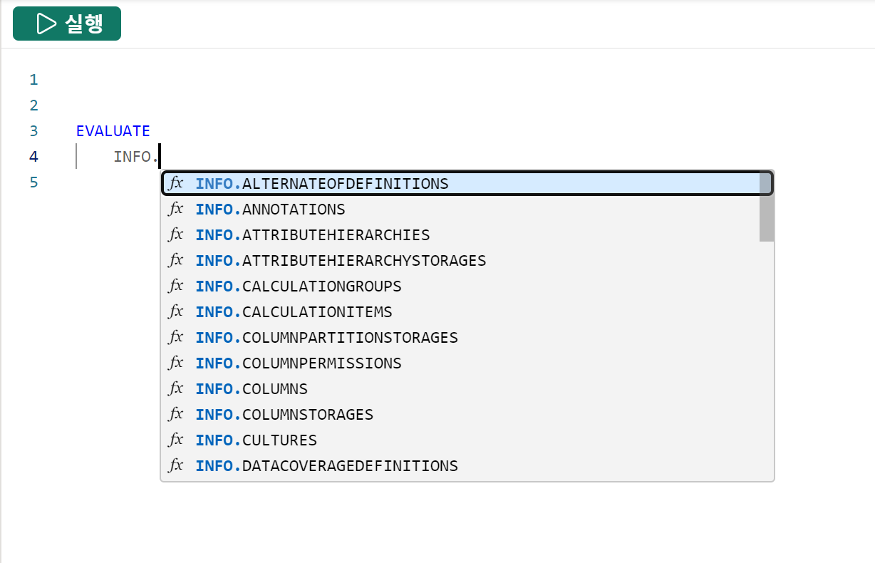 DAX 쿼리 보기로 이동하여 EVALUTE에서 INFO. 을 입력하면 지원되는 함수 목록을 확인할 수 있습니다.