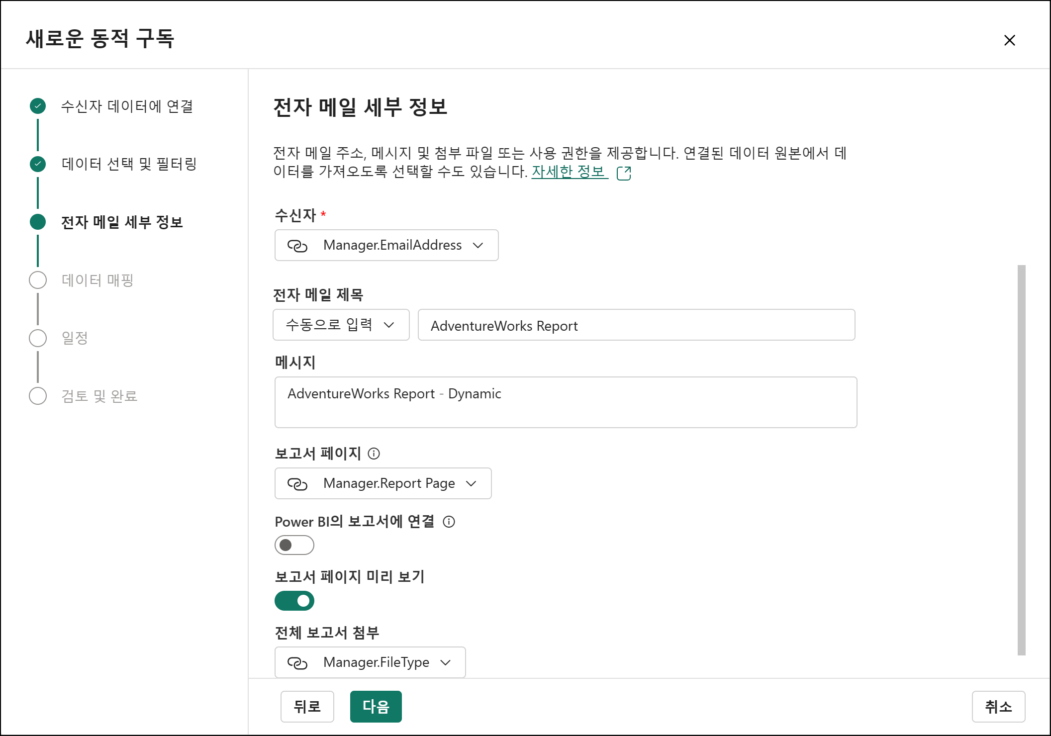 수신자당 동적 보고서 구독은 수신자 정보(이메일, 볼 보고서 페이지 정보, 보고서 첨부, 필터 정보) 데이터를 먼저 연결해야 합니다. 그래서 DB 테이블 등에 수신자 정보를 가지고 있고 Power BI에 게시되어야 합니다.